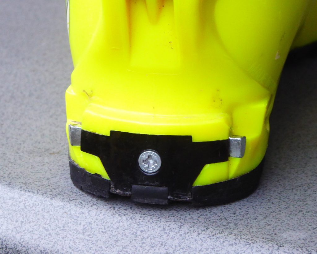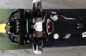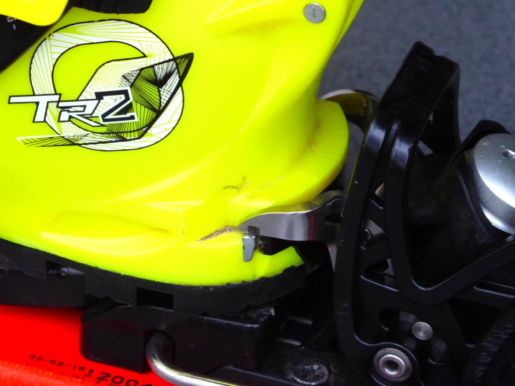Bevor ich überhaupt mit dieser Bindung in den Schnee gehe, sollte ich aber erst einmal die Gleitpatte vorn auf meinen Stiefel einstellen; im Abfahrstmodus rutscht die Stiefelsohel – wie bei jeder Alpinbindung – für die Seitwärtsauslsösung über eine Gleitplatte, die ich mit Hilfe seitlicher Stellschrauben auf meine Sohlendicke einstellen kann. Diese Möglichkeit muss ausdrücklich gelobt werden! Die Sohlenstärke , das Profil und die Aufbiegung der Sohlen ist bei den Tourenstiefel im Unterschied zu den Alpinstiefeln sehr unterschiedlich, die Bindung muss darauf eingestellt werden. Bei vielen PinBindungen ist das nicht möglich, und die Z-Werte, die für die Pinarme vorn eingestellt werden können, werden so schnell nur „Makulatur“; die vorn stark aufgebogene Sohle wird von den eingerasteten Pins eventuell so stark auf die Auflage gedrückt, dass die hohe Reibung die Auslösekraft komplett verändert!