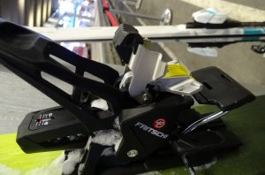 Die Fritschi Tecton ist auch eine halbe Hybridbindung – Pins vorn, alpiner Fersenautomat hinten – Und das spezielle – neben der hohen Qualität und Funktionalität + Sicherheit – an den Fritschi Bindung ist, dass sie komplett in der Schweiz hergestellt und dann in Reichenbach im Berner Oberland zusammengebaut und geprüft wird – Swiss made. Die Fritschi Tectron ist sehr einfach und intuitiv zu bedienen; für den Walkmechanismus wird der Fersenautomat über einen Hebel nach hinter geschoben, in diesem Hebel steckt auch die 2-stufife Aufstiegshilfe, die gut mit dem Skistock bedient werden kann. Beim genauen Hinschauen erkennt man am Fersenautomat der Fritschi Tecton eine der Spezialitäten dieser Bindung aus dem Berner Oberland: Der Fersenautomat greift im Abfahrtsmodus zusätzlich zur Halterung am Sohlenrand mit den sog, Power Rails – kurze Kunststoffansätze – direkt in die Sohlen-Aussparungen für die Pin-Stifte der Standard-Pinbindungen. Dadurch wird der Schuh seitwärts sehr gut fixiert und der gesamte Fersenautomat konnte kompakt konstruiert werden. Fritschi hat so hier die Pin-Funktionalität beim Schuh genutzt, um eine innovative Lösung zu entwickeln. Durch diese zusätzliche Fixierung der Ferse kann man diese Bindung natürlich auch nur mit Stiefeln benutzen, die die Aussparungen an der Rückseite der Sohle haben; das ist aber bei allen pingeeigneten Tourenschuhen Standard. Eine weitere Spezialität der Tectron-Bindung ist die hohe seitliche Flexibilität der vorderen Bindung: ein schmaler Gleitschlitten verschiebt sich bei Seitwärsbelastungen bis max. 13 mm seitwärts, ohne dass die Bindung auslöst. Erst bei stärkerem Druck klappe ein Pinarm zur Seite, der Stiefel wird frei. Der Fersenautomat verfügt auch über eine 9 mm Flexibilität bis es zur Auslösung. Bei einer Frontalauslösung drückt vorn die Stiefelnase gegen einen Block – Release Lever – der sofort die Pinarme öffnet, der Schuh wird vorn auch sofort freigegeben. Der Pintec -Teil der Bindung löst auch im Walkmodus trotz blockierter Klemmung bei großer Krafteinwirkung aus – Fritschi nennt es „Notauslösung im Aufstieg“.