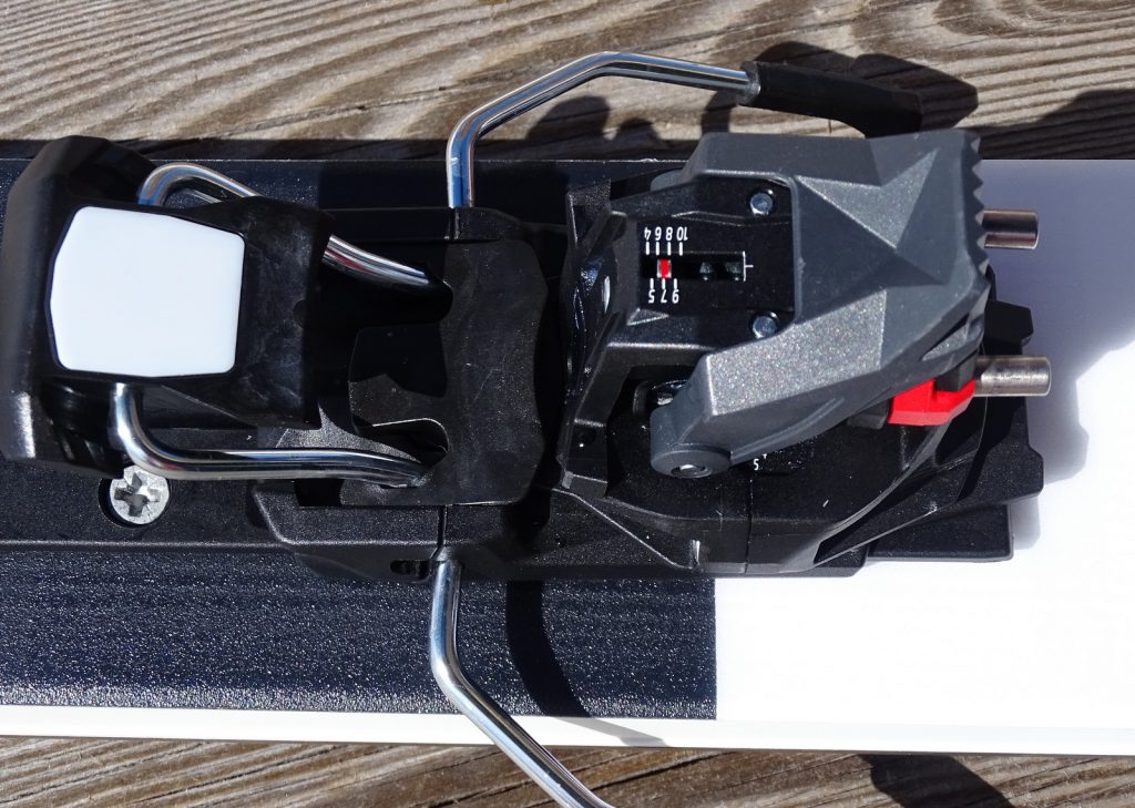 Das Fersenteil ist über ein breites Bohrbild stabil montiert, verfügt über ein Drehgelenk mit großem Durchmesser und bietet im Abfahrtsmodus eine Längenelastizität von 10 mm. Die DIN-Werte für Seitwärts- und Frontalauslösung sind separat und stufenlos einstellbar, die beiden Zapfen sind von einander unabhängig gelagert und sind drehbar – also keine U-förmige Konstruktion. Und der Einstellbereich reicht vom Z-Wert 4 bis 10; insgesamt ein hohes Sicherheitsniveau! Der Einstieg hinten funktioniert auch relativ leicht, ein kurzer Druck und fertig.