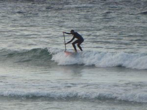 Das merkt man deutlich beim Rauspaddeln gegen die Wellen. Man kann das Inflatable bis zur Belastungsgrenze aufpumpen, die Steifigkeit eines Handboards wird nicht erreicht. Wenn man die Welle anpaddelt, kann man wie ein Wilder paddeln, das Board lässt trotzdem sehr „geschmeidig“ die Welle durchgehen, man erwischt sie nicht. Die einzige Möglichkeit ist, die Welle hinter sich brechen und sich von der Weißwasserwalze mitnehmen zu lassen.