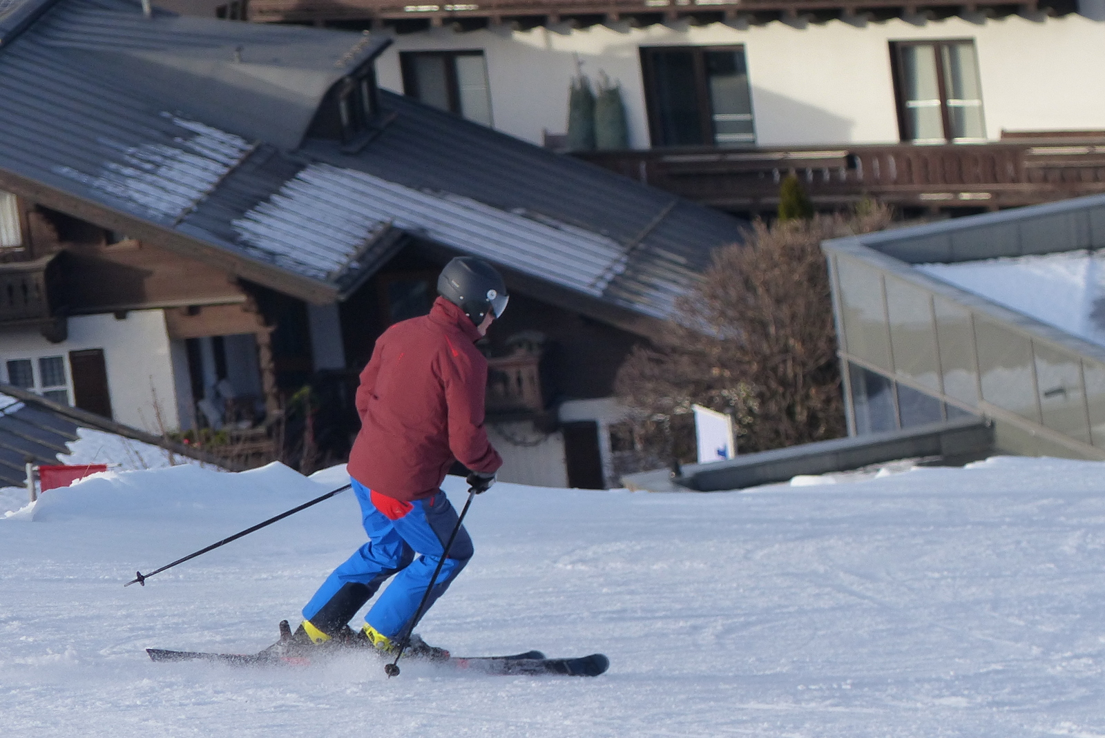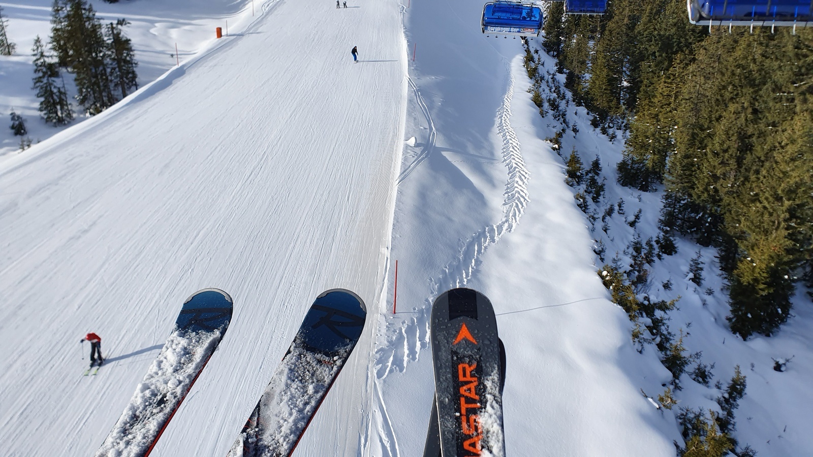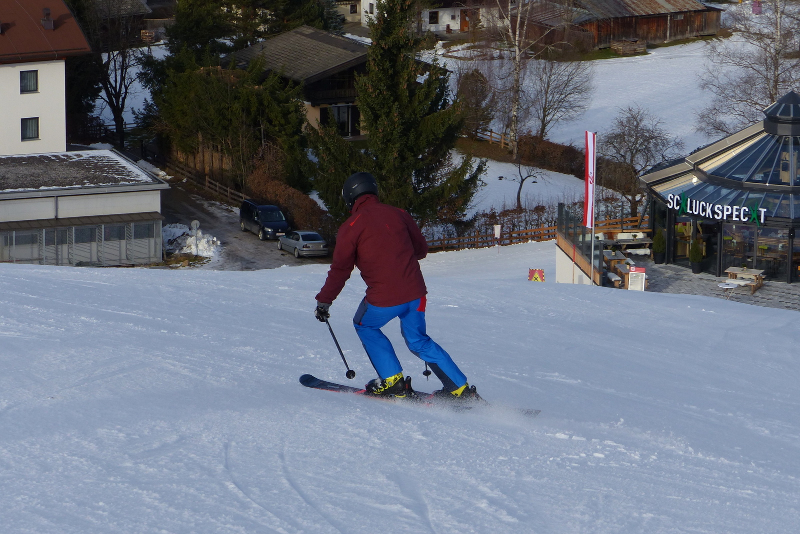 Im weicheren Schnee – z. B. Kunstschnee-Sulz am Nachmittag oder auf dem Südhang – sind allerdings lange schnelle Schwünge ein Genuss. Die breite Rockerschaufel pflügt dank der Stabilität der Konstruktion überall durch, der Ski führt sauber auf der Kante, der Belastungswechsel wird aktiv unterstützt.