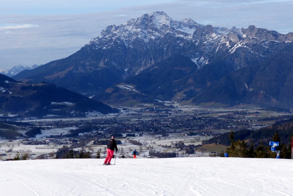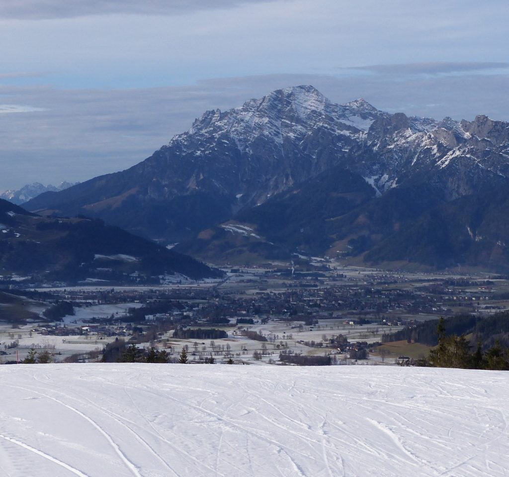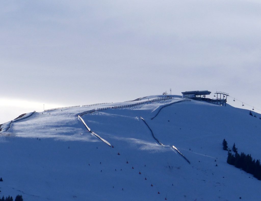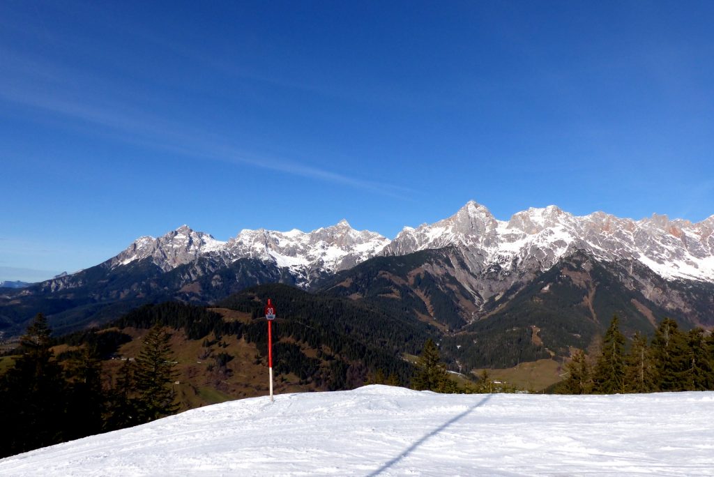 Für uns ist aber leider unten in Dienten die Königstour vorerst beendet; unsere Skikarten lösen an der Sperre ein unwiderrufliches „Karte ungültig“ aus – kein Eintritt in das Innere des Königreichs. Nach einigen Telefonaten und klärenden Gesprächen mit dem wirklich netten und ausgesprochen kompetenten Kassenpersonal stellt sich heraus, dass an der Kasse in der Talstation Arlberg versehentlich für uns Karten ausgedruckt wurden, die es eigentlich gar nicht gibt! Unsere Karten haben nur eine auf die Teilgebiete Maria Alm und Aberg bis oben auf den Gahübel begrenzte Gültigkeit; solche Karten gibt es eigentlich nur für einheimische Grundbesitzer, auf deren Grund und Boden die Piste verläuft oder Seilbahnanlagen stehen. Also zurück zur Talstation Aberg, um uns die richtigen Karten neu ausdrucken zu lassen? Wir entscheiden uns dafür, die Königstour abzukürzen und dann später mal bei besserem Schnee mit mehr Naturschnee nachzuholen; wir kehren um und genießen erst einmal die Rücktour mit der Abfahrt Nr. 30 vom Gahübel nach Hintermoos und der Abfahrt von der Krollalm zur Aberg Talstation genossen. Die Abfahrt vom Gahübel nach Hintermoos ist eine wahre Panorama-Abfahrt mit Blick auf den Aberg und das Steinerne Meer.