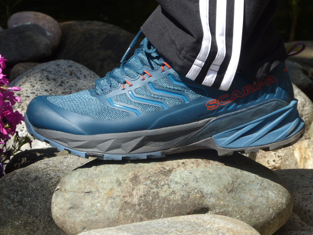 Der Scarpa RUSH ist ein guter Multifunktions-Trailschuh für Trailrunning, Hiking und auch Nordic Walking. Seine starke EVA Zwischensohle + Fersenkeil und die stabile Fersenkappe + seitlicher PU-Streifen + stabiler Zehenschutz sorgen für gute Dämpfung und Schutz. Der Griff der stark profilierten Sohle ist hervorragend, der Mittelfuß sitzt sehr gut unter der sockenartigen Zunge.