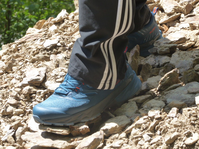 Diese 100 Gramm Mehrgewicht spielen aber eine Rolle hinsichtlich der größeren Vielseitigkeit, denn der RUSH spielt seine Stärke in unwegsamem Gelände aus. Rutschige Wurzelpassagen, Schotterwege, Geröll, ja sogar felsiges Terrain sind kein Problem. Die Sohle „greift“ und hält, der Schuh ist ausreichend torsionsstabil, die Dämpfung ist nicht schwammig, das Durchdrücken von scharfen Ecken und Kanten wird minimiert.