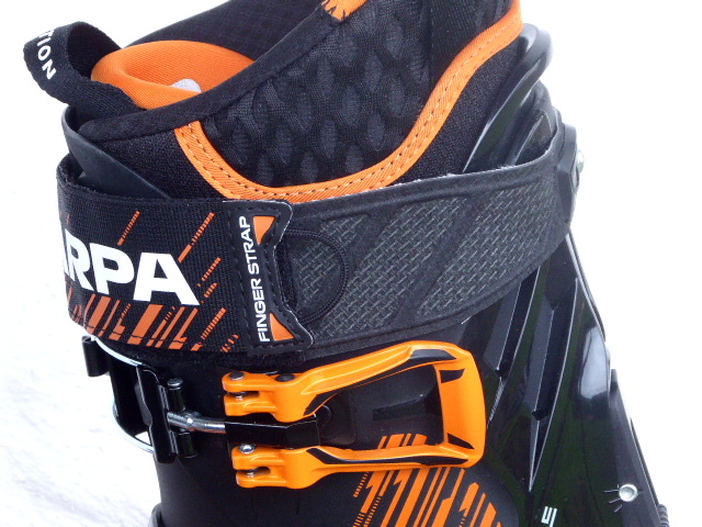 Das Profil der Vibramsohle wurde etwas geändert, es ist jetzt ein sog. CAYMAN-Profil mit besserem Grip, mehr Haltbarkeit, aber nach wie vor kompatibel mit allen TLT-Bindungen. Der „neue“ Maestrale hat einige Gramm an Gewicht zugelegt ( Gr. 27.0/ 1440g ), weil die Schale (Pebex Rnew) an der Ferse und seitlich verstärkt wurde und es einen geänderten Power Block gibt. Dieser Mechanismus bietet im Skimodus die hohe Steifigkeit eines schaftfixierten Stiefels, während der Winkel des vorderen Schafts angepasst werden kann. Im Walk-Modus bietet der Stiefel dann einen hervorragenden Komfort und eine Bewegungsfreiheit von insgesamt 60° ( 46° nach vorn/14° nach hinten ). Verändert hat sich das Zungendesign. Man klappt nicht mehr die komplette Zunge beim Einstieg zur Seite, sondern biegt die einfach weit nach vorn. Der Einstieg wird jetzt noch leichter, denn gerade bei großer Kälte war das Ab- und wieder Zurückklappen der dann manchmal etwas sperrigen Zunge etwas „pfriemelig“. Neu sind auch Finger Straps – ein spezielles benutzerfreundliches Design, welches Öffnen und Schließen der Schnallen und des Velcro-Bandes (Power Strap) mit Handschuhen erleichtert. Der extrabreite Powerstrap (mit integriertem RECCO-Chip) bietet eine perfekte Unterstützung der Zunge und verhindert den Rückprall des oberen Stiefelbereiches gegen das Schienbein.