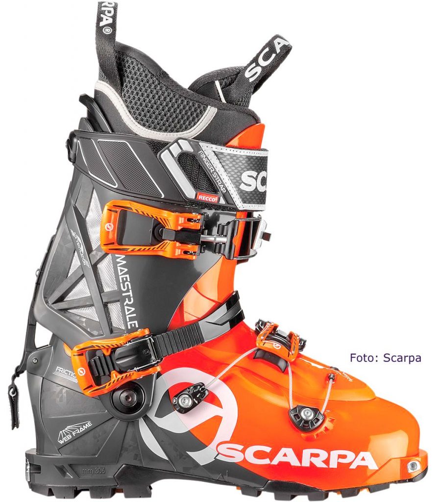 Scarpa hat die „MAESTRALE-Familie“ mit den Modellen RS und XT mittlerweile breiter aufgestellt und seinem Allround – Klassiker MAESTRALE mal wieder eine „Frischzellenkur“ verpasst. Das Erscheinungsbild/ die Farbgebung ist allerdings seit Jahren unverkennbar geblieben, man muss schon genauer hinschauen. Einige Aspekte wie der leichte Einstieg, bedingt durch die Axial Alpine EVO Konstruktion, viel Komfort im Aufstieg, sowie Performance bei der Abfahrt, bleiben natürlich. Auch die bootfitting-Möglichkeit, die Schale mit Hilfe der Infrarottechnologie ( beim Fachhandel )anzupassen, den Innenschuh auch zu Hause im Backofen ( 8-10 Min bei 80° ) zu „backen“, ist geblieben.