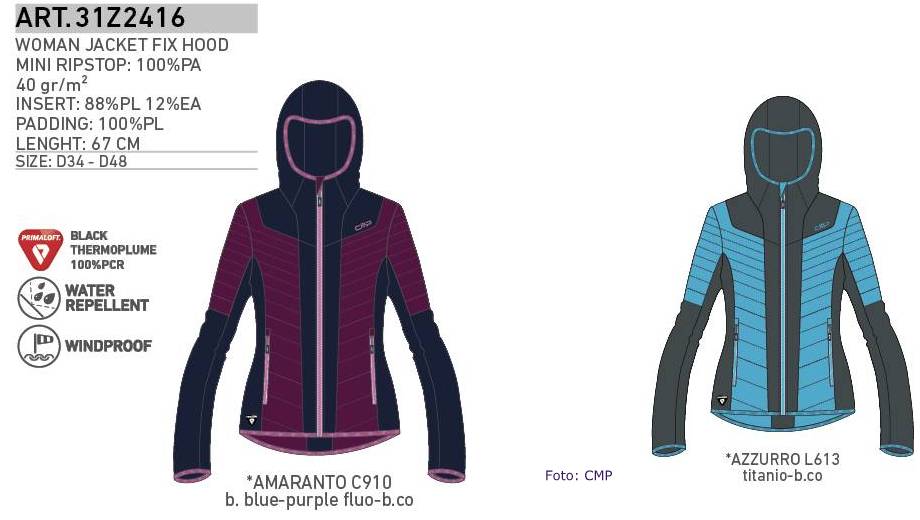 Hybridjacke -Kapuze mit elastischem Saum, Reißverschluss vorne mit winddichter Innenklappe und Anti-Chafing-Abdeckung, 2 große Seitentaschen mit Reißverschluss, winddicht, Primaloft Thermoplume 100% recycelt, ergonomische Passform, elastische Manschetten und Stretch-Performance-Einsätze.