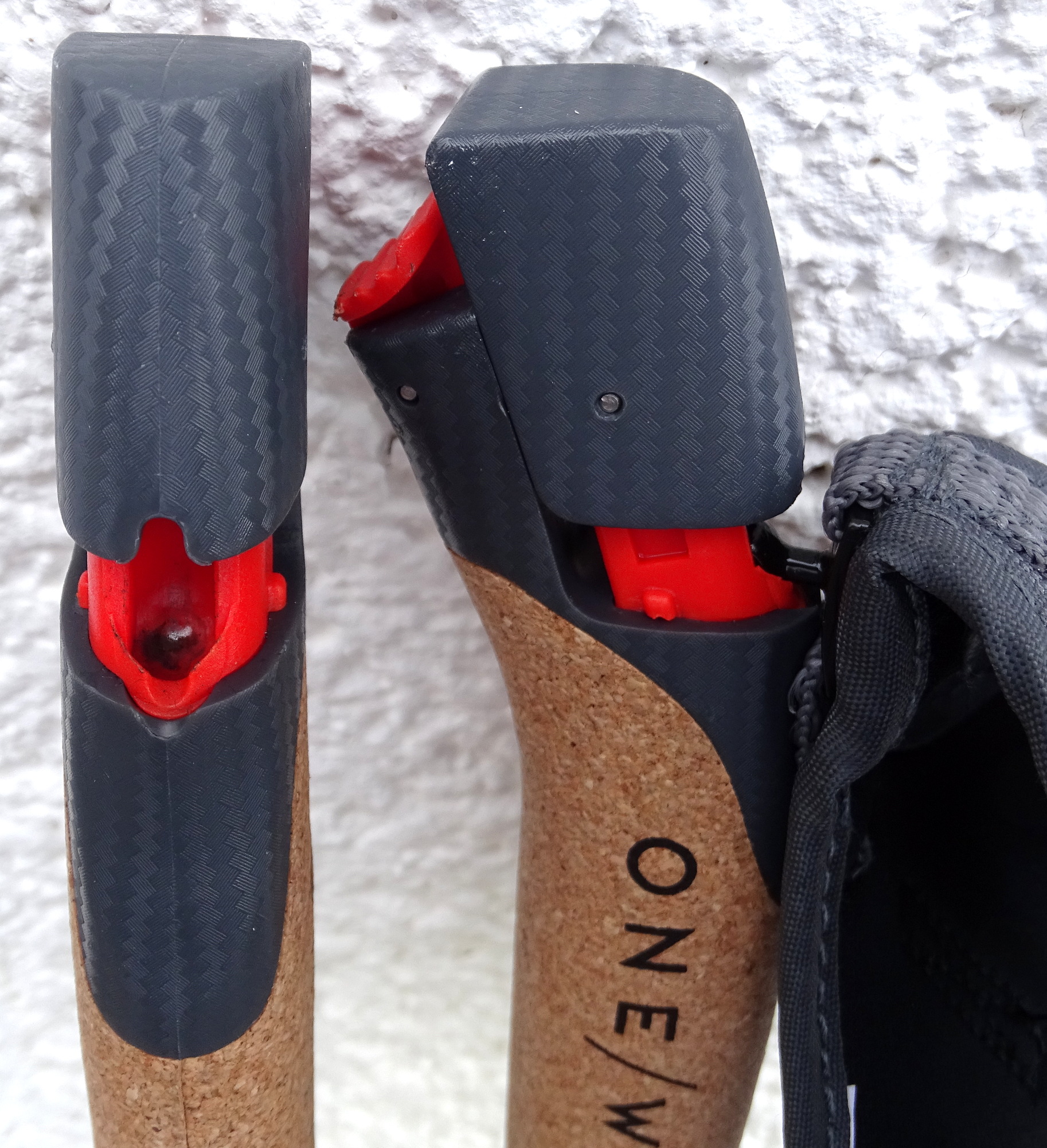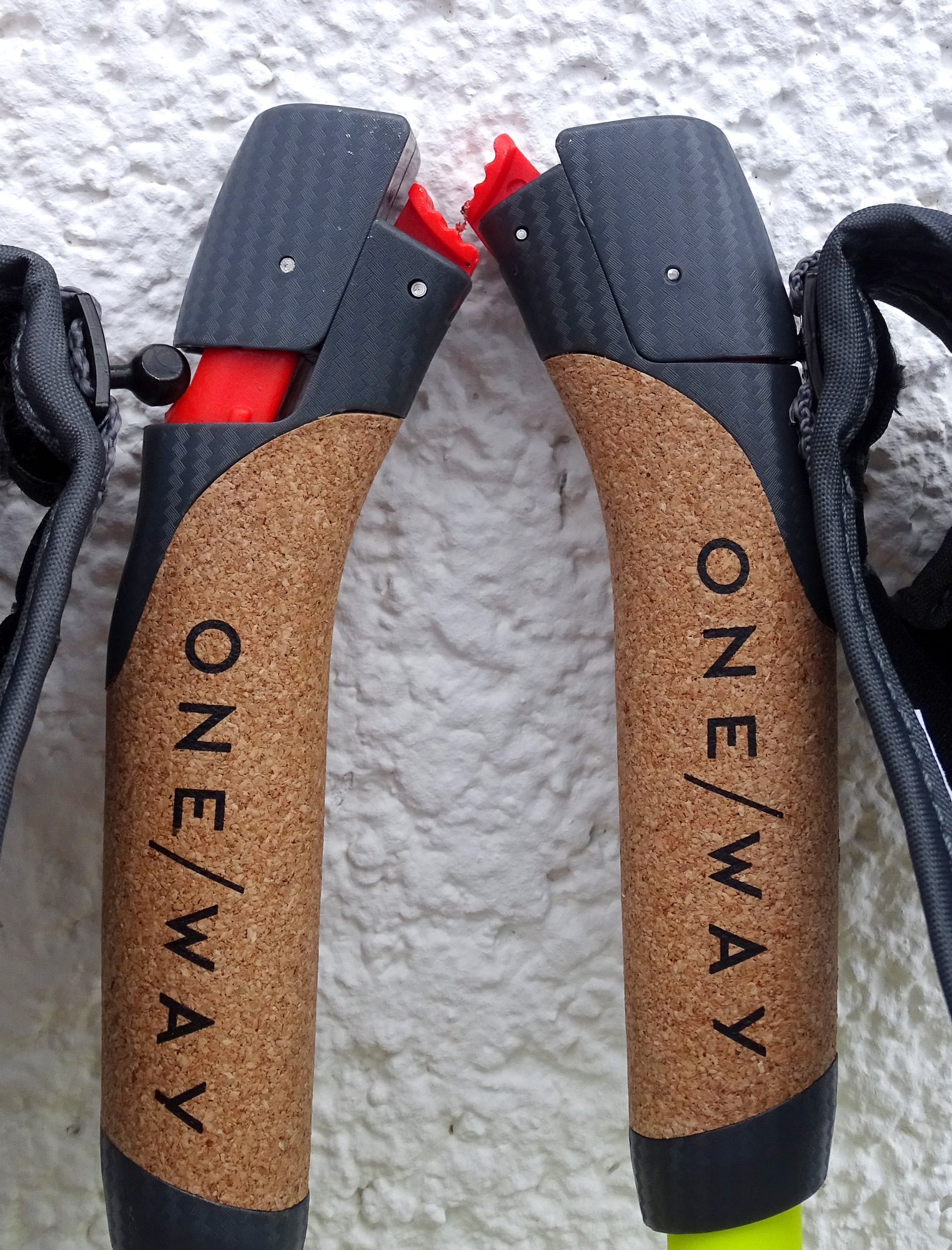 Bei den Carbonstöcken ( OneWay MAG2 ) ist besonders die Handschlaufe erwähnenswert, die sich durch Knopfdruck – es ist ein magnetisches Befestigungssystem-vom Stock lösen lässt. Die gut sitzende Handschlaufe und der ergonomische Griff sorgen für gute Kontrolle und Kraftübertragung.