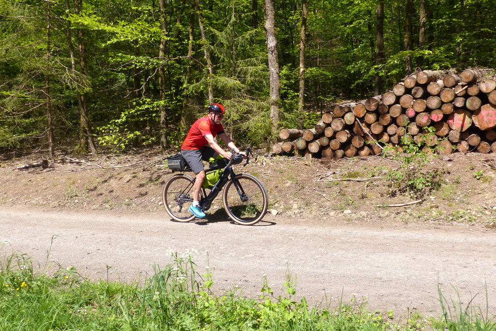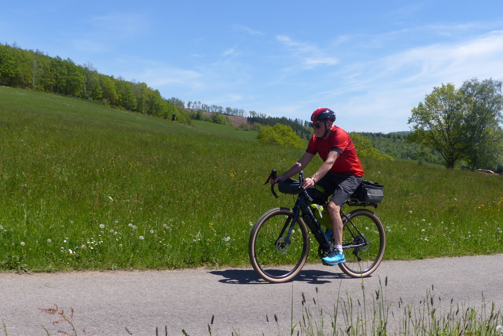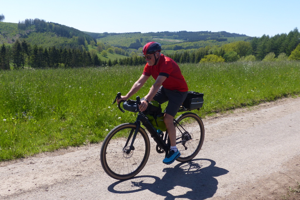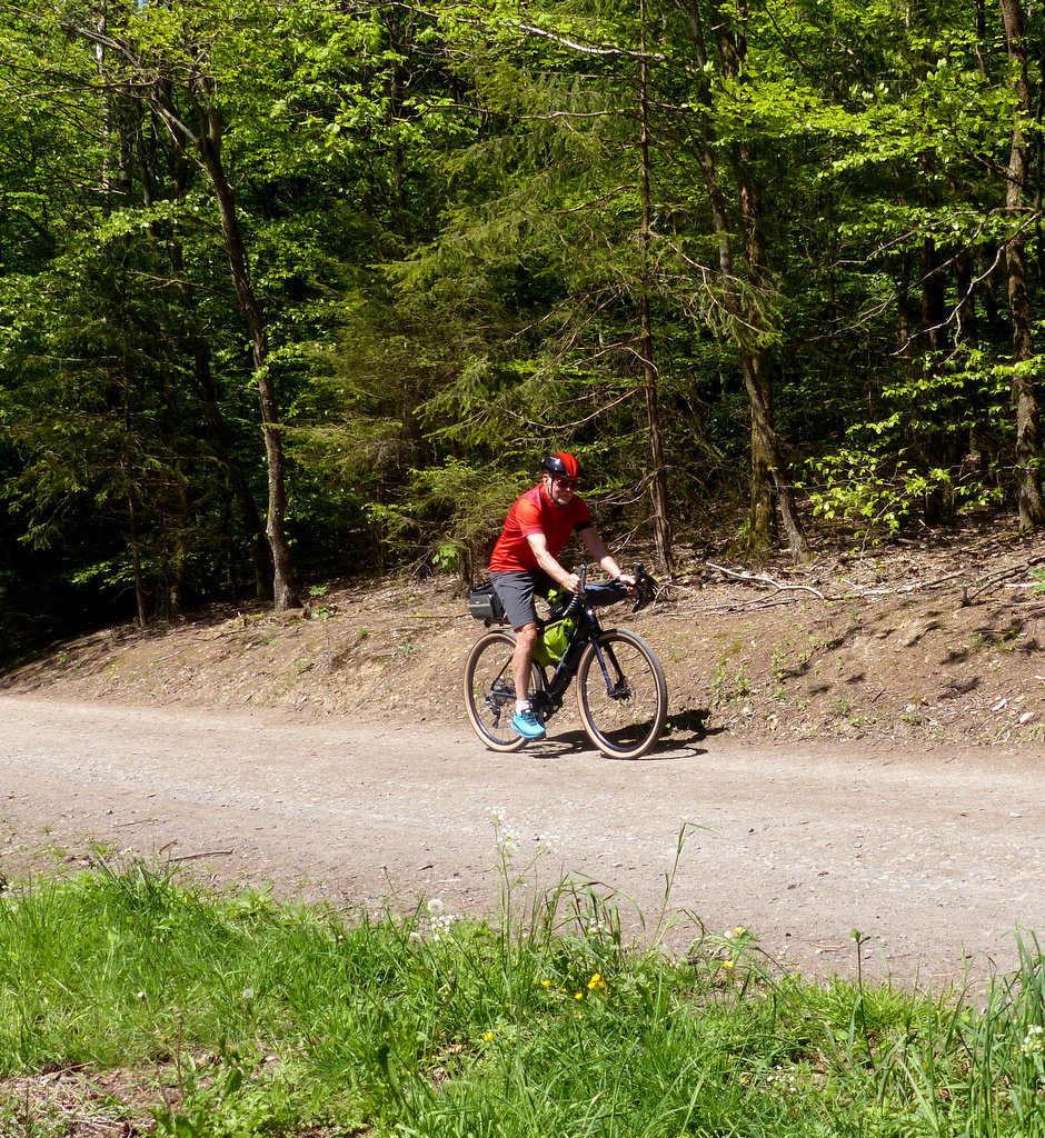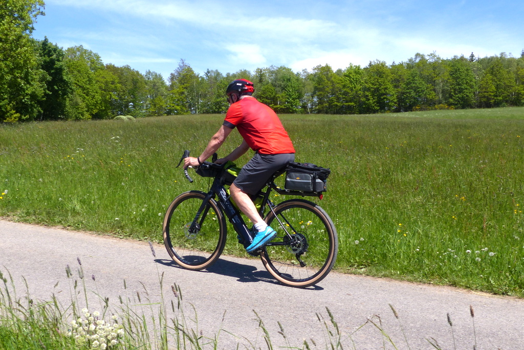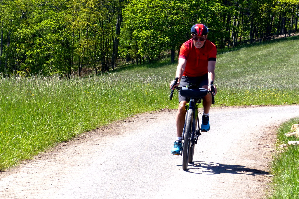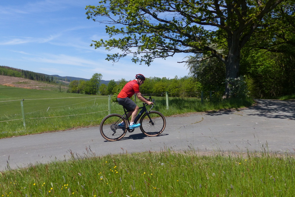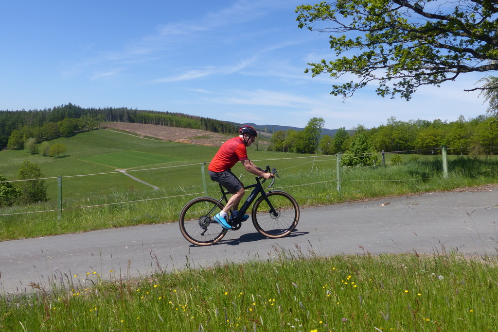 Die ersten Kilometer mit dem Testrad mache ich auf der Straße, eine meiner heimischen 40km Rennrad-Trainingsstrecken mit 2 knackigen Anstiegen/Abfahrten. Das Corratec E-ALLROAD fährt sich absolut unproblematisch, die Sitzposition ist nicht so sportlich wie auf meinem Rennrad, die Schaltung ist sehr bergtauglich und die Scheibenbremsen sind auf den schnellen Abfahrten mit engen Kurven ein nicht zu vernachlässigender Sicherheitsfaktor. Der Motor schiebt bergauf spürbar, obwohl er auf dieser Strecke ,als Trainingsstrecke gefahren, eigentlich nicht nötig ist, die Schaltung mit der 11erKassette 11-13-15-17-19-21-24-28-32-37-42 in Kombination mit dem 42er Kettenblatt ist absolut kletterfähig, Auf der nächsten Trainingsfahrt bleibt die Antriebseinheit zu Hause und das Rad ist damit 3,6kg leichter – der große Vorteil des Fazua-Antriebs. Auf leicht abschüssiger Strecke fehlt aber dann doch die Übersetzung meiner Rennrad-Schaltung; hier kann ich mit dem 52er Kettenblatt vorn noch bei deutlich höheren Geschwindigkeiten als mit der Gravel-Schaltung Druck machen.