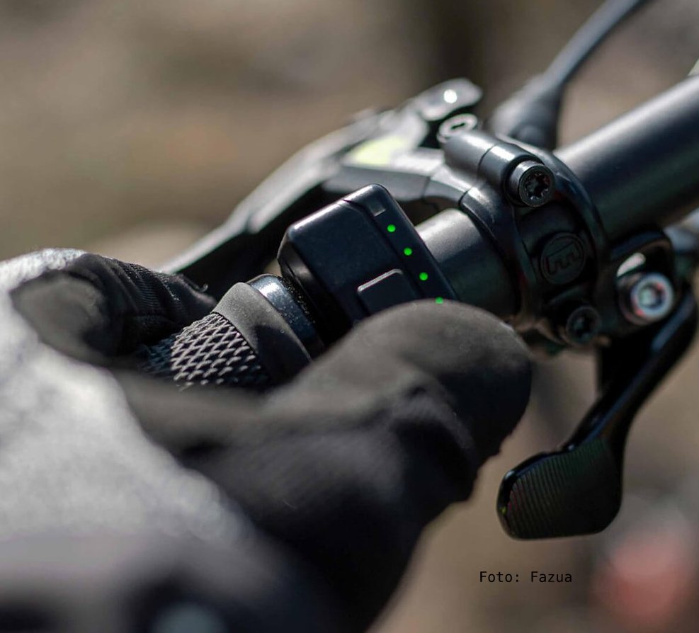Fazua bietet neben diesem rahmenintegrierten Bedienelement – REMOTE FX – auch ein Bedienelement für den Lenker – REMOTE BX – und eins neben dem Vorbau – REMOTE RX – an.