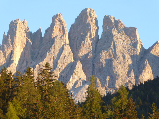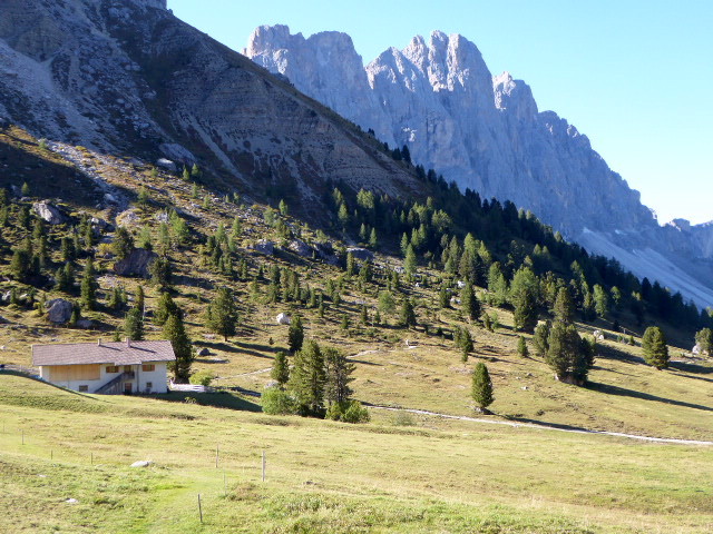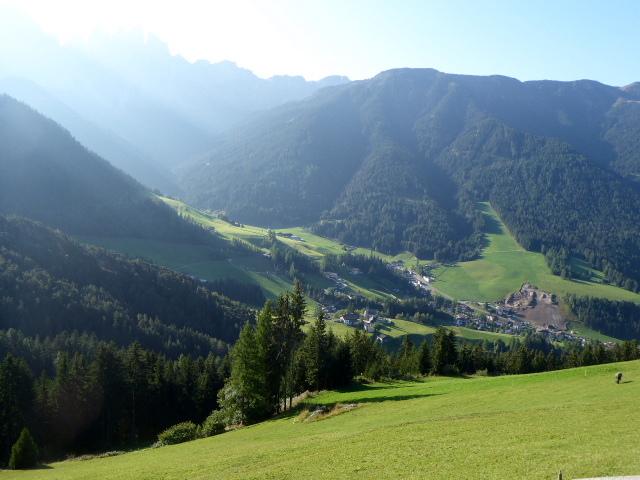 Die erste Tour war eine Hüttenrunde über geschotterte Almwege. Über die Zanseralm hoch zur Schlüterhütte ( etwa 1000 Höhenmeter ), von dort wieder runter bis Ranui, weil der Verbindungsweg direkt unter den Geislerspitzen – der Adolf Munkel Weg – für Radfahrer gesperrt ist, und dann noch einmal, aber dieses Mal „nur“ über 650 Höhenmeter hoch zur Geisleralm. Diese Strecke ist zwar kürzer, dafür gibt es aber einige steile Rampen mit über 20% Steigung.