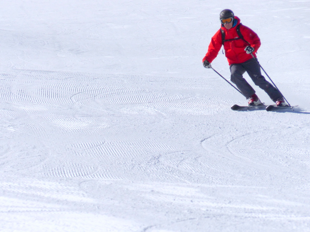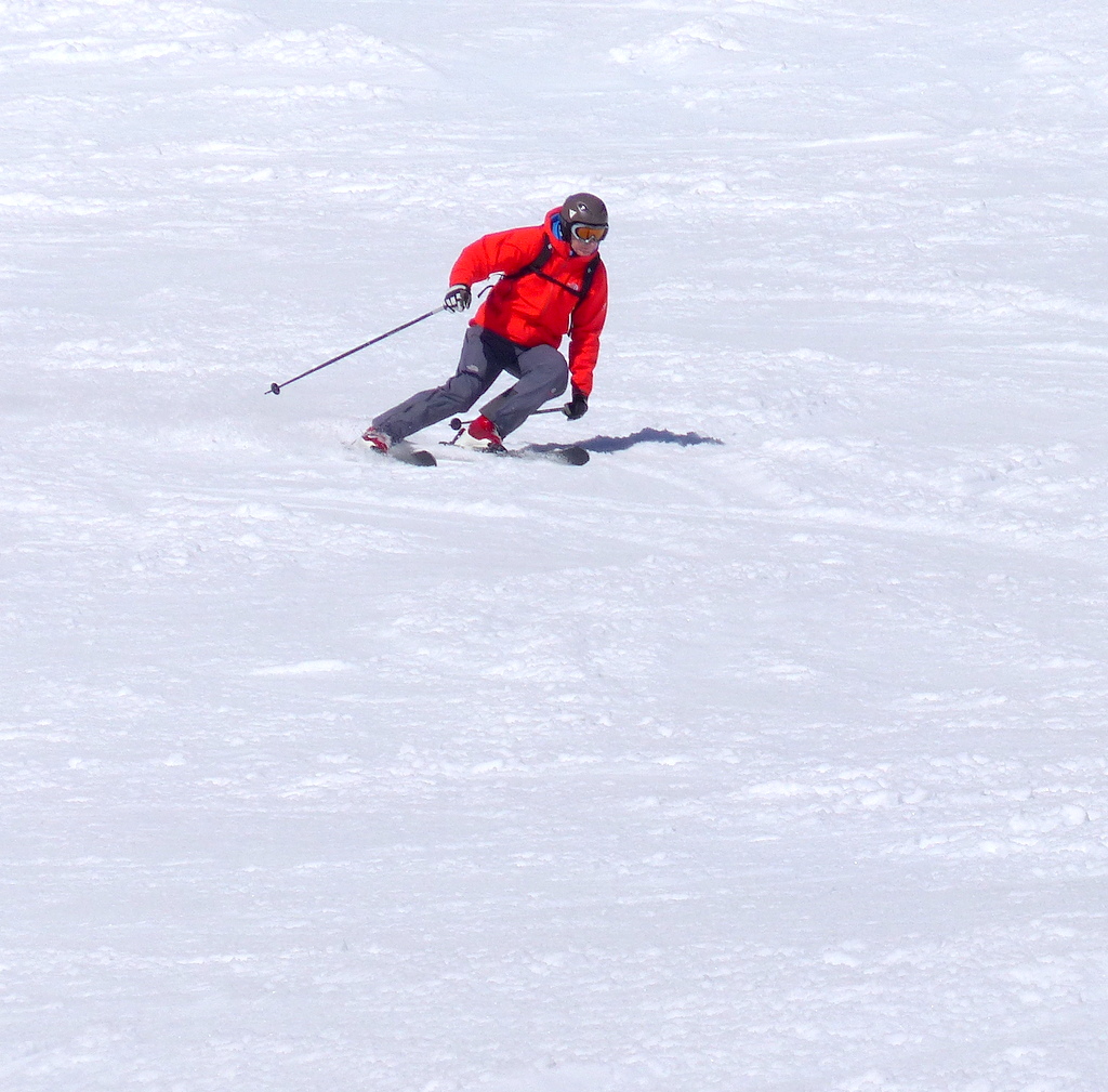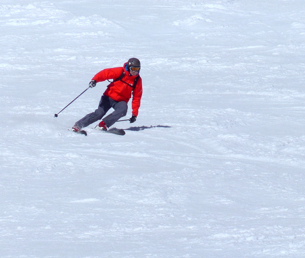 Der Ski kann aber auch langsam, ganz kontrolliert und entspannt gefahren werden, auch gedriftete Schwünge sind kein Problem. Kurzschwüngen, Bremsschwünge, Carvingschwünge, der Ski kann alles! Für richtig lange Schwünge bei hohem Tempo ist der unser 165 cm lange Testski zu kurz – nur Länge lauft, und wenn ich wirklich lange auf der Kante fahre, dann zieht die Taillierung ganz harmonisch bergauf, aber für ganz lange Schwünge ist der Ski ja auch nicht gebaut, hier hat Andre Voigt VR – Spezialski ja schließlichnoch den Snowrider RC Race im Angebot.