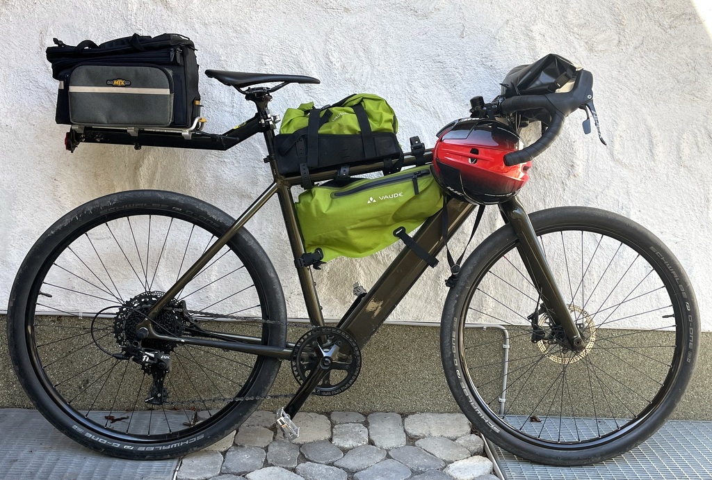 Klar, das Mehrgewicht durch Motor + Akku spielt bei Rädern, die eh nur knapp 10 kg wiegen, natürlich schon eine gewichtige Rolle, und generell hat der E-Motor auch bei Gravelbikes sicherlich einen anderen Stellenwert als z. B. bei City- oder Tourenbikes. Der E-Motor am Gravelbike ist eher nicht so sehr im Dauerbetrieb in Gebrauch, auf ebener Strecke fährt man ein Gravelbike häufig im Geschwindigkeitsbereich oberhalb der 25kmh Grenze. Aber die Motorunterstützung nimmt steilen Anstiegen die Qual und lange Touren mit reichlich Höhenmetern werden zu einem Genuss ohne Erschöpfung, das gilt natürlich in besonderem Maße bei Touren mit Gepäck. Diese Räder sind ja oft auch mit diversen Befestigungsmöglichkeiten für Gepäck u. ä. ausgestattet, haben also auch das Potential für Touren mit Gepäck.