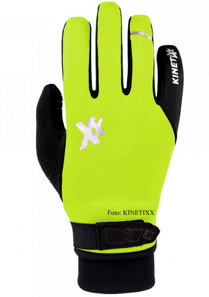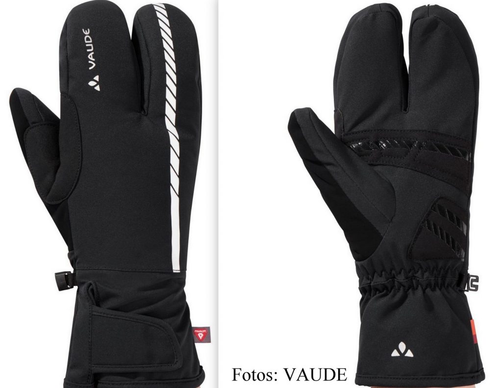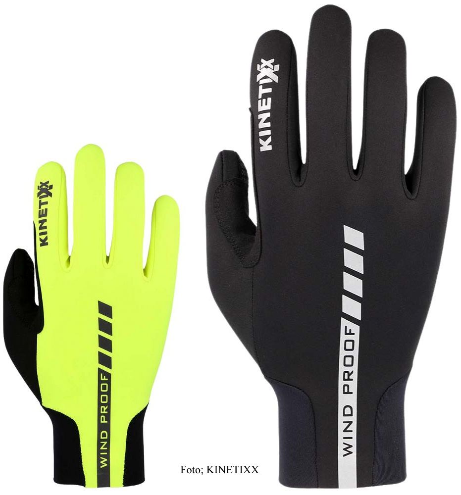 Handschuhe sollen auf jeden Fall winddichtund innen angeraut oder mit Fleece ausgestattet sein, und die Innenhand ist griffig, der Handschuh darf an den Lenkergriffen nicht abrutschen. Neben den üblichen Fingerhandschuhen gibt es speziell fürs Radfahren die sog. Hummer- oder Lobster-Handschuhe; jeweils 2 Finger sind zusammen in einem Futter, die Handschuhe sind dadurch noch wärmer als normale Fingerhandschuhe; in Kombination mit z. B. einem hochwertigen Primaloft-Futter, wasserdichtem und atmungsaktivem Außenmaterial und einer griffigen Innenhand haben wir hiermit Radhandschuhe für tiefe Temperaturen. Für extreme Temperaturen oder auch sehr kälteempfindliche Biker gibt es auch heizbare Radhandschuhe. Mit einem kleinen leistungsfähigen Akku in der Handschuhstulpe oder auf dem Handschuhrücken und einer Laufzeit von (je nach Hersteller) 3 – 5 Std. kann man so schon der Kälte einige Kilometer trotzen.