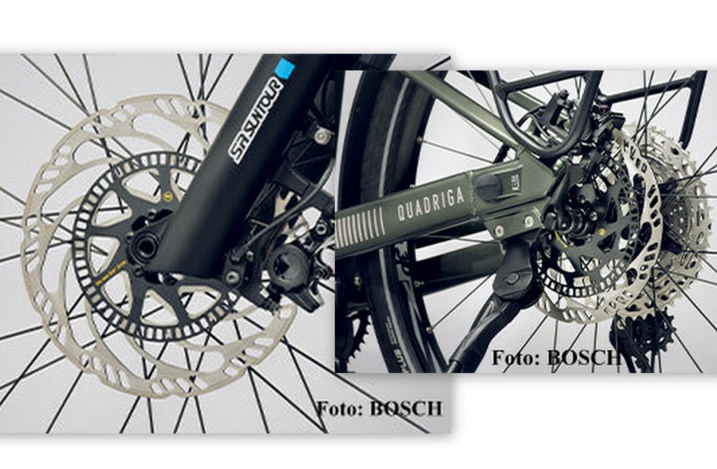 Bosch: Das ABS-System beim Bremsen mit dem Pedelec wirkt nur auf das Vorderrad. ABS-Sensoren an den Bremsscheiben beider Räder registrieren deren Raddrehzahlen: Wenn das Vorderrad zum Blockieren neigt, greift die Steuereinheit blitzschnell ein und senkt den Druck an der Hydraulikbremse des Vorderrads so lange ab, bis es wieder rollen kann. Im Anschluss daran wird wieder Bremsdruck aufgebaut. Dieser Vorgang wird bei Bedarf vielfach pro Sekunde wiederholt, sodass der Fahrer oder die Fahrerin auch bei ganz durchgezogenem Bremshebel sicher zum Stehen kommt. Und das ABS verhindert auch noch, dass das Hinterrad im extremen Bremsvorgang abhebt – dafür die ABS-Sensoren an der Hinterrad-Bremsscheibe, und das Rad sich dann eventuell überschlägt.