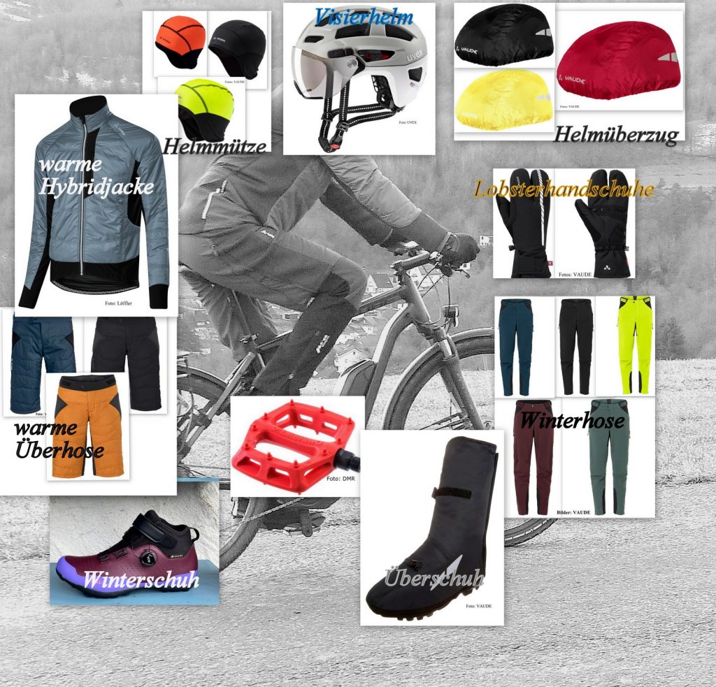 Das Fahrrad selbst muss natürlich auch „winterfest“ sein, Beleuchtung und Bremsen müssen in Ordnung sein, Schutzbleche als Spritzschutz sind hilfreich, Reifen und Pedale lassen sich auch noch für den Wintereinsatz optimieren.