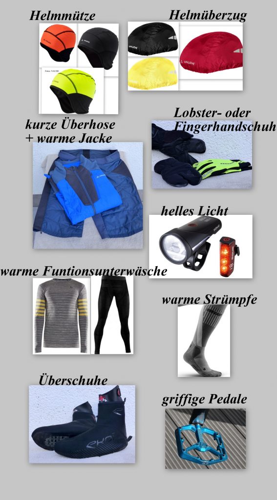 Anders als beim Laufen sind die Füße beim Fahrradfahren kaum in Bewegung und kühlen dadurch sehr schnell aus; Winterschuhe oder/und Überschuhe sind hier ein guter Kälteschutz