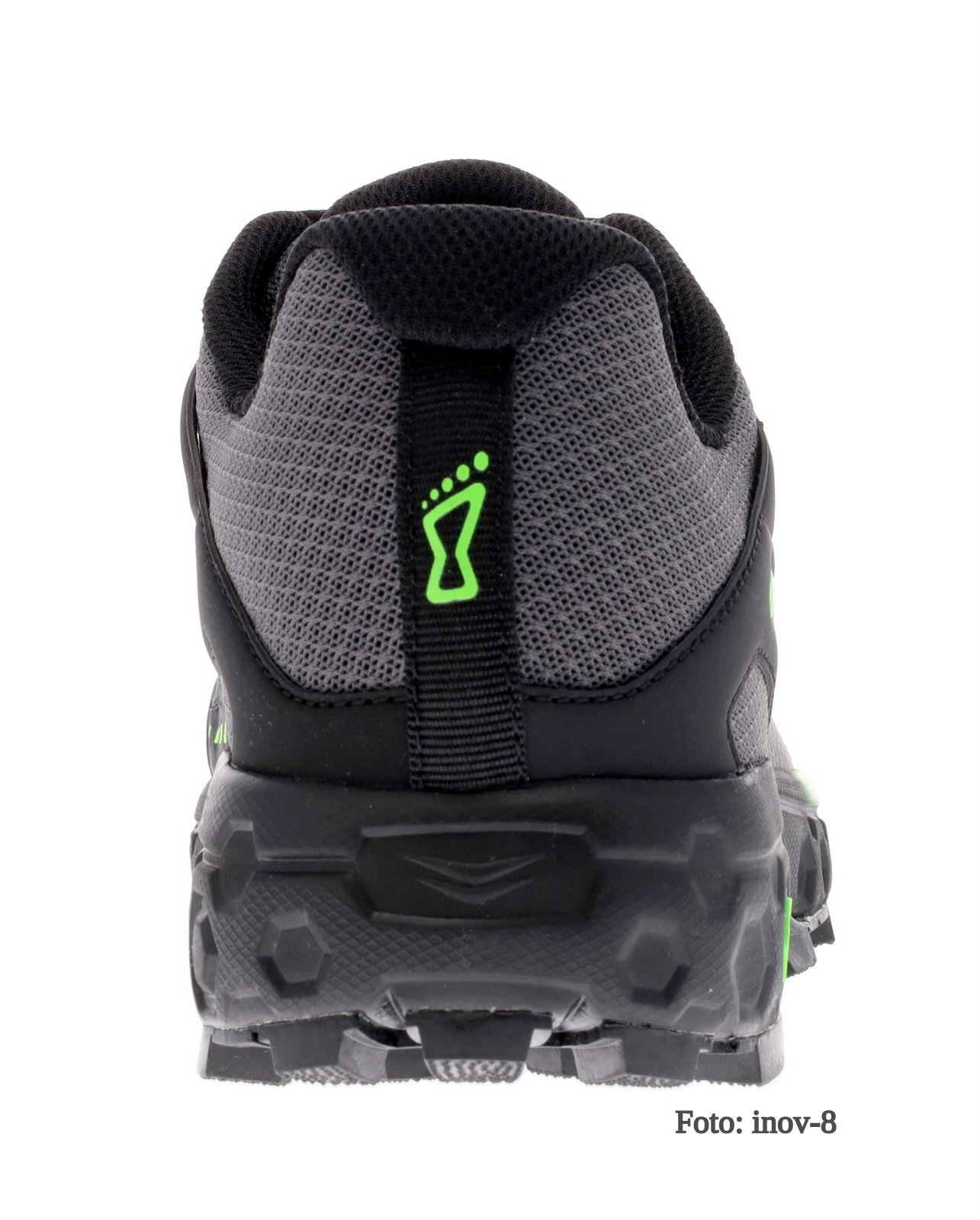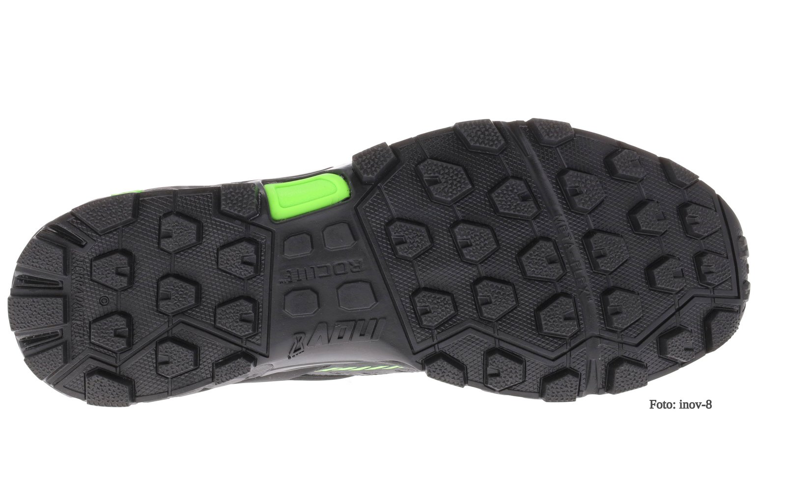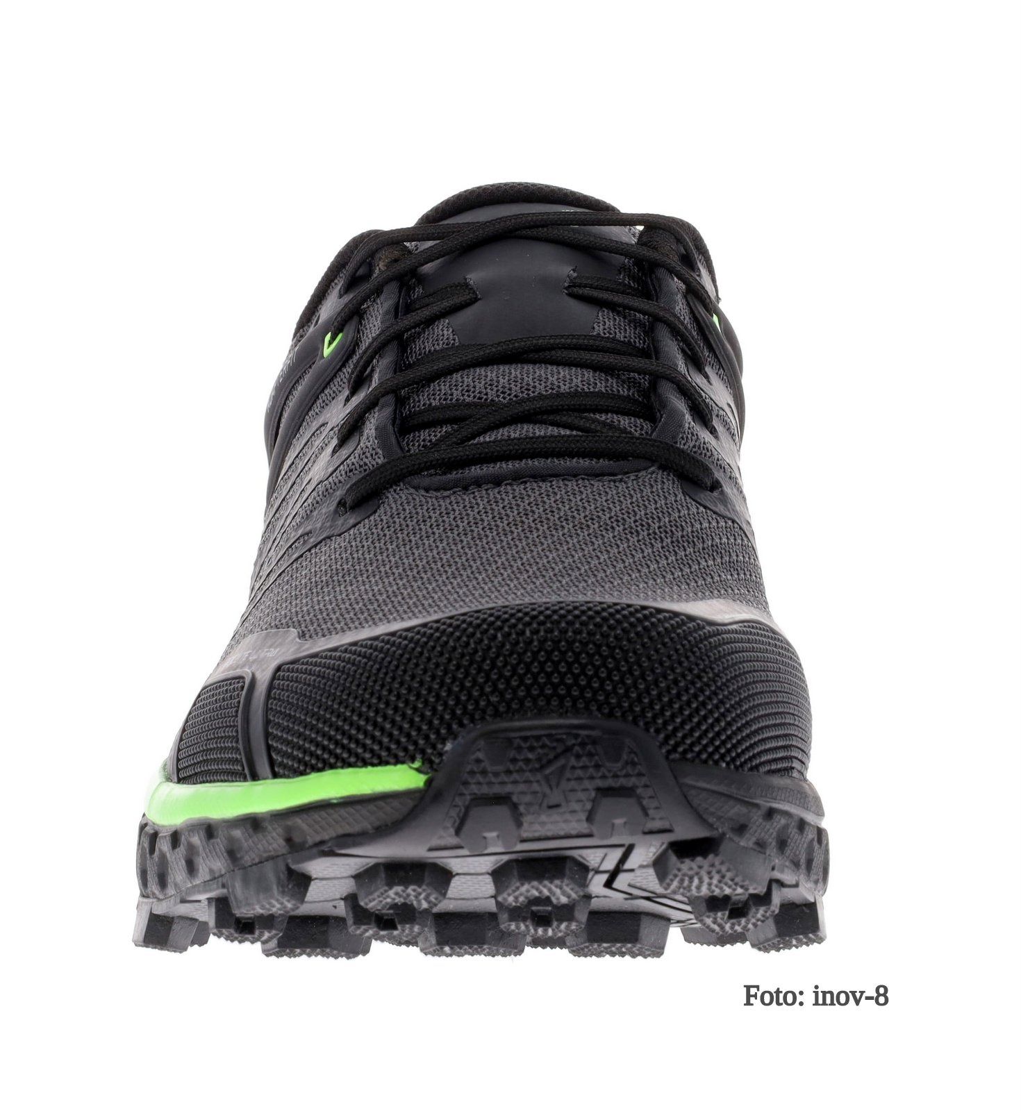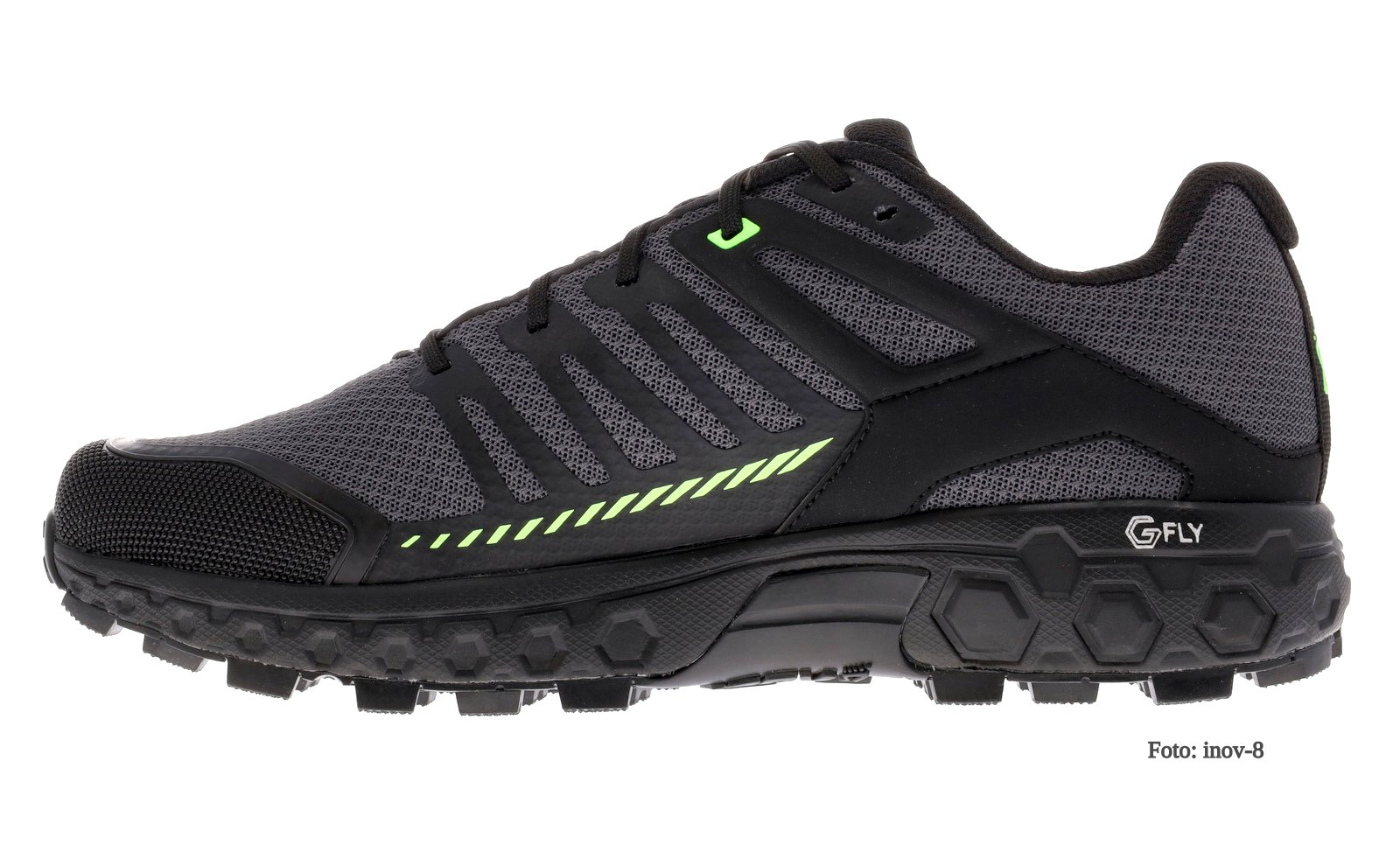 Die Bezeichnung „Boomerang-Fußbett“ ist schon ein hoher Anspruch, die mit Graphen vertärkten Sohlen sind ja aber auch schon etwas Besonderes. Inov-8: „Die G-FLY Graphene-Schaum Dämpfung bietet eine um 25 % höhere Energierückgabe, die länger anhält. Am Trail sowie im weglosen Gelände bieten die mit Graphen verstärkten 6-mm-Stollen auf allen Untergründen, von hartem Felsen bis zu weichem Sumpf, verlässlichen Grip, das superrobustes neues Mesh-Obermaterial, eine verbesserte Passform, eine flexible Felsplatte und ein verstärkter Zehenschutz“ sorgen für Schutz und sicheren Tritt.