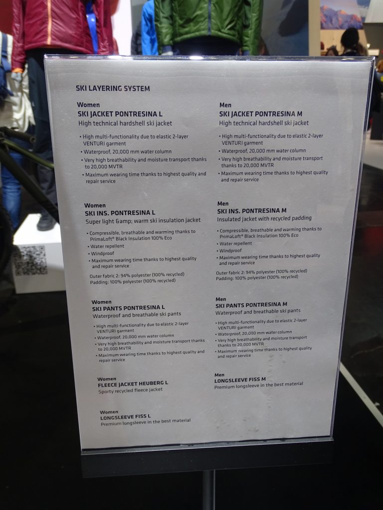 Bei der Ski Oberbekleidung gibt es einige neue Jacken und Hosen in der Kombination zwischen wasser- und winddichter und atmunsaktiver Funktionsmembrane und Primaloft – Isolationsmaterial oder Daune.