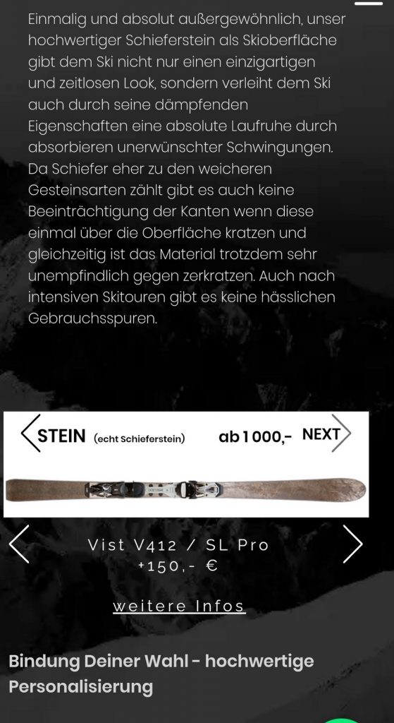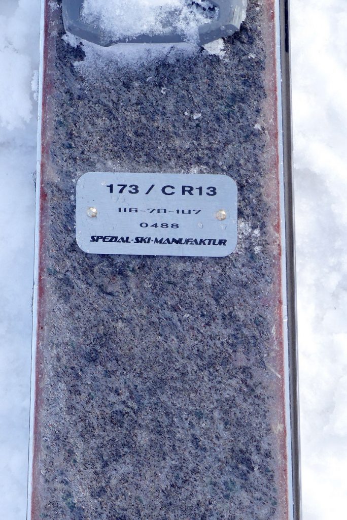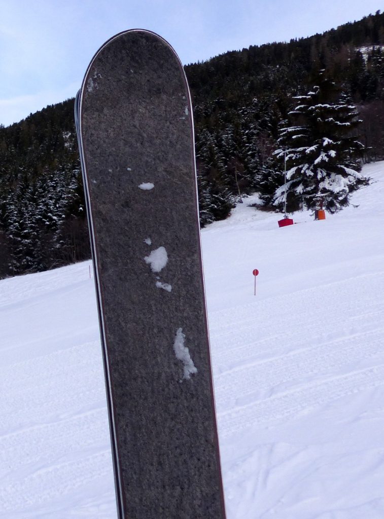 Unser Testski ist mit der Oberfläche Stein, echter Schieferstein, ausgestattet; ein ungewöhnliches Outfit, schlicht und edel.