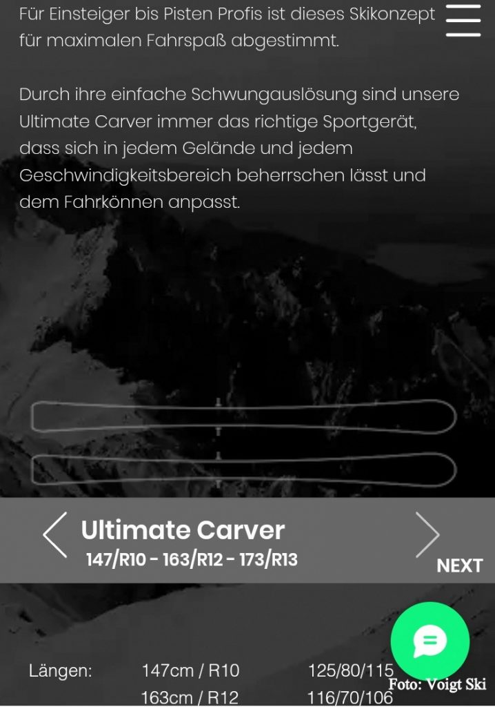 Ultimate Carver – „Für Einsteiger bis Pisten Profis ist dieses Skikonzept für maximalen Fahrspaß abgestimmt. Durch ihre einfache Schwungauslösung sind unsere Ultimate Carver immer das richtige Sportgerät, dass sich in jedem Gelände und jedem Geschwindigkeitsbereich beherrschen lässt und dem Fahrkönnen anpasst.“