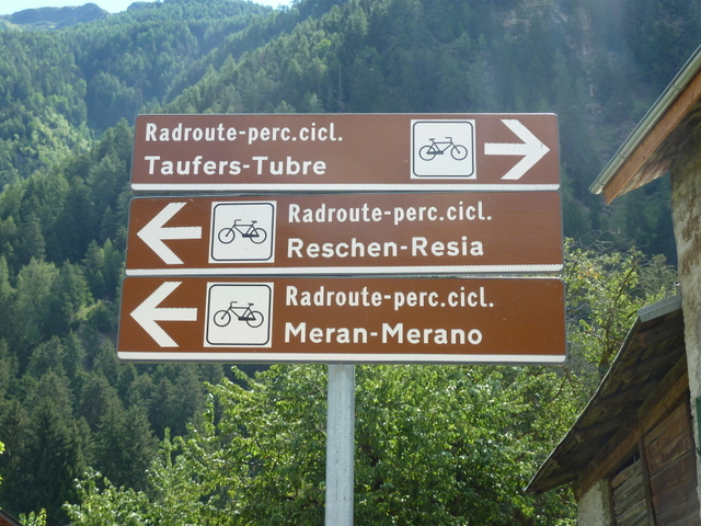 Vom Reschenpass bis Meran und dann weiter über Bozen bis Saturn gibt es einen durchgehenden Radweg, den Etschtal-Radweg, der häufig entfernt von der Landesstraße durch Obstplantagen und kleine Orte führt. Der Radweg ist tatsächlich nur für Radfahrer angelegt; keine Notlösung, keine halbherzige Schmalspur an der Straße – immer auch für Gegenverkehr breit genug, eine interessante Streckenführung, sehr gut ausgeschildert und immer mal wieder ein Gasthof oder Restaurant oder einfache Ratsplätze an der Strecke für Selbstversorger. Wir sind zum Reschenpass hoch und vom Pass bis Meran runter, wir haben auf Teilabschnitten die Reschenbahn benutzt, wir sind auch von Meran auf dem neuen Passer Radweg Richtung St. Leonard gefahren, der Passeiertal-Radweg gilt als einer der schönsten im Meraner Land und führt ohne große Steigungen ins urige Passeiertal, und wir haben über Glurns einen Abstecher ins Münstertal Richtung Schweiz gemacht.
