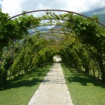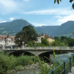 Unser Favorit ist die Strecke von Laas nach Meran; bevor es bei Algund nach Meran runter geht kann man am Hang auf großen Holzliegestühlen ganz entspannt den Blick über Meran genießen; neben dem Radweg führt ein begrünter Laubengang hier zu zwei mächtigen Liegestühlen, bevor der Radweg dann nach abwechslungsreicher Abfahrt 150 Höhenmeter tiefer auf die Passerpromenade im Zentrum von Meran führt. Insgesamt ca. 45 km durch Apfelplantagen, entlang der Etsch, mit wunderschön geführten Abfahrten, durch und entlang schöner Dörfer, einfach ein Genuss! Meran ist natürlich immer auch einen Besuch wert; die Promenade an der Passer mit Kurhaus und Therme, die Innenstadt um die Laubengasse, diverse Museen, Burgen und Schlösser. Zurück nach Laas haben wir die Vinschgerbahn benutzt; diese relativ neue Bahn fährt von Meran bis Mals – ca. 12 km vor St. Valentin a. d. Haide, dem Beginn der Reschenhöhe – und ist auf Radtransport eingestellt.
