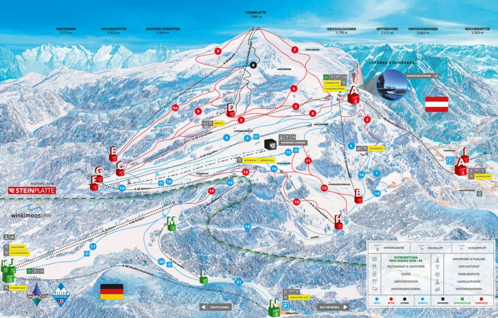 Anschluss an das Skigebiet Winklmoos-Alm/ Steinplatte bis 1.900 m Meereshöhe mit 14 Liftanlagen und 44 Kilometer präparierte Pisten.