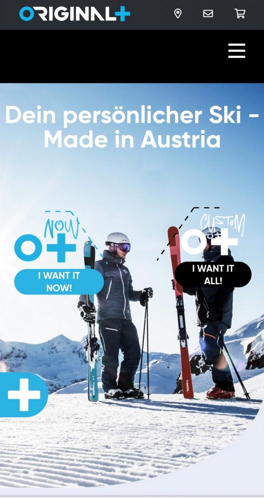 ORIGINAL+ ist ein österreichischer Skihersteller, der sich am Standort in der Nähe von Salzburg auf die Produktion maßgefertigter Ski spezialisiert hat. Gemäß dem Motto „Skifahren nach Mass“ wird mit Hilfe der Konfigurationssoftware „ORIO“ ein Ski nach individuellen Interessen/Angaben im Rahmen einiger Vorgaben bzgl. Einsatzzweck (z. B. Slalom, Riesenslalom, Allmonutain, Freeride, Tour), Längen und Taillierungsmaßen individuell konfiguriert; Längsflex, Torsionsstabilität, Dämpfungseigenschaften und letztendlich auch das Tuning werden individuell angepasst + dann auch der Vorschlag für eine Bindung – ein Ski nach Maß, und das zu einem wirklichen „Kampfpreis“von ca. 1000,- €.