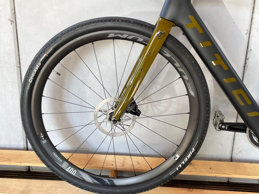 Der Rahmen ist so konzipiert, dass er großzügig dimensionierte Reifen bis zu 700cx44 oder auch 650bx48 aufnehmen kann und damit auch extreme Trails mit maximalem Spaß bewältigt werden können. Auf unserem Rad war der Pinarello Cinturato h ( 700×45 ) montiert, eine gute Kombination für Straße und Schotterwege.