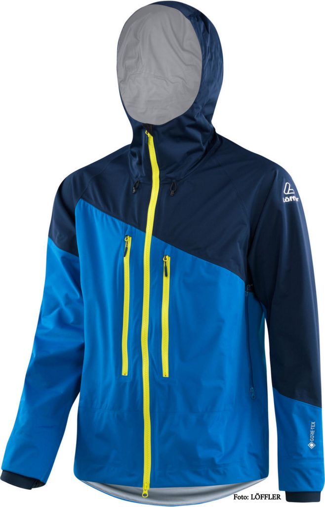 GOTE-TEX-AKTIVE, 100% wasserdicht, winddicht, besonders atmungsaktiv. Weiches 3-Lagen Material, helmtaugliche angeschnittene u. Regulierbare Kapuze, wasserdichter 2-Wege Frontzip, 2 extralange Zip-Eingrifftaschen, 2 Lüftungszips, Ärmelbündchen, Bundweitenregulierung.