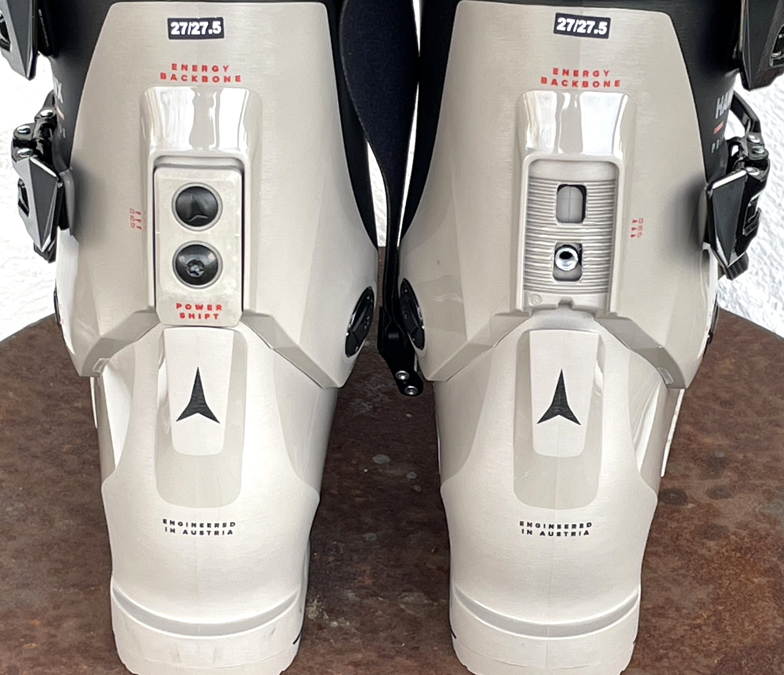 Uns hat positiv überrascht, dass offenbar der alte Spruch „Skifahren ist Kniefahren“ wieder eine Rolle spielt, denn das sog. „Power Shift“ ermöglicht das Verstellen von Vorlagewinkel und Flex, dazu gibt es noch einen Spoiler, den man per Klett am Innenschuh befestigen kann.