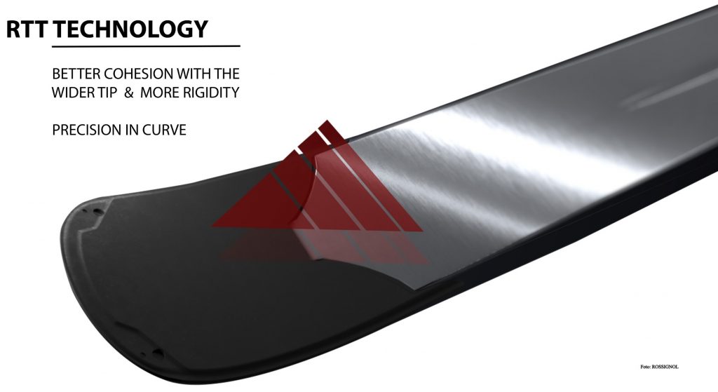 RTT: (Reinforced Torsion Tip) ist eine Technologie, die für diese neue Art von modernen Ski mit extrem breiten Spitzen angepasst und dimensioniert wurde, um die Torsionsstabilität im Schaufelbereich zu erhalten. Die besondere „Schlips“-Form der Titanal-Schicht ist im eingebauten Teil der Spitzen eingebettet, um die Kohäsion und die Kraftübertragung zu verbessern.