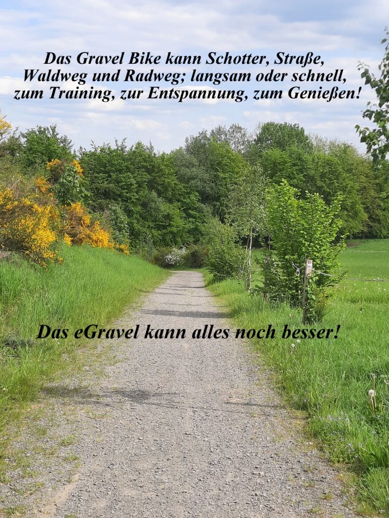 E-Gravel Bikes verstärken die Vielfältigkeit der Gravelbikes noch mal um einen deutlichen Faktor, der E-Motor bietet zu all den Stärken und Möglichkeiten des Gravelbikes noch die Unterstützung durch einen hightec-Motor, wobei diese Unterstützung mittlerweile auch noch sehr detailliert/genau dosiert werden kann. Durch diese Unterstützung werden die Stärken/Möglichkeiten des Gravelbikes uneingeschränkt verstärkt; kein Berg zu steil oder zu lang, Grenzen werden verschoben, bergauf Fahren wird zum Landschaftserlebnis.