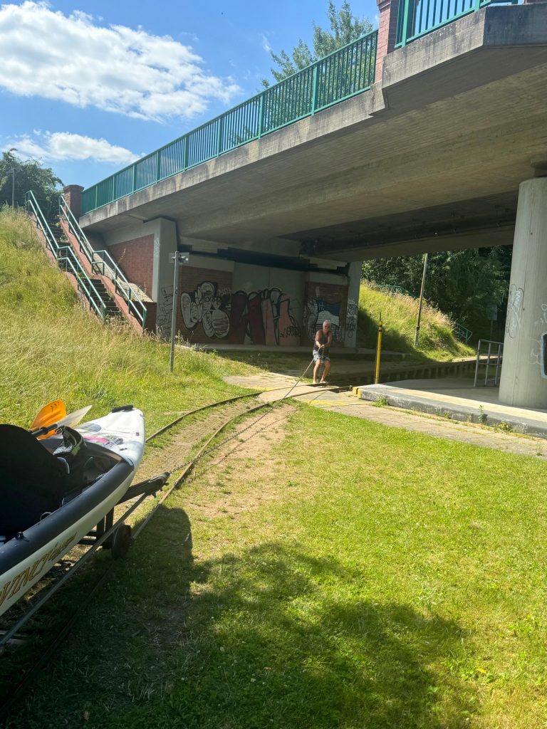 Bei den meisten Schleusen kann man, wenn es voll wird, die Wartezeit vermeiden, das Boot mit einer Lore transportieren und hinter der Schleuse wieder zu Wasser lassen.
