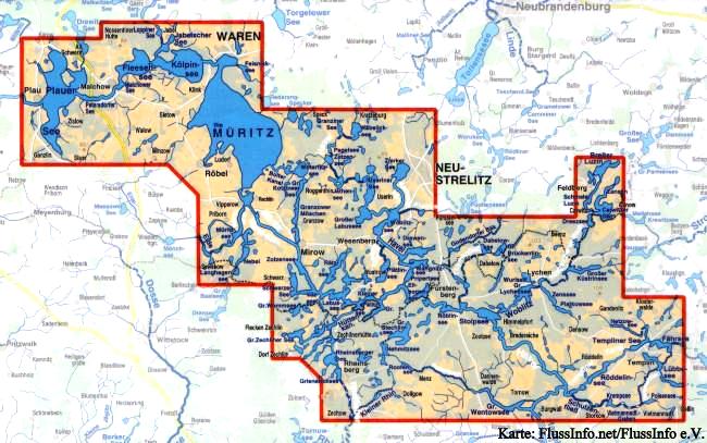 Von unserem Campingplatz über den Labussee , durch die Diemitzer Schleuse in den Vilzsee, durch den Mössensee in den Zotzensee, durch den Kanal in den Mirowersee nach Mirow. Oder aber weiter, und ab jetzt ohne Motorboote, durchs Ganzower Möschen, den kleinen und großen Kotzowersee, Leppin– und Woterfizsee bis zur Bolter Schleuse. Hier muss man das Boot ca. 50m tragen, setzt dann in den Bolter Kanal und kommt zur Müritz. (Übernachtungsmöglichkeit Müritzhöh).
