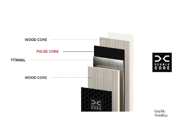 Das „Herzsück“ des Steadfast 85 TI DC von Nordica ist die Energy TI Double Core Konstruktion; der Holzkern besteht aus zwei übereinanderliegenden Schichten, zwischen denen eine Elastomerschicht + eine Titanalschicht liegen.