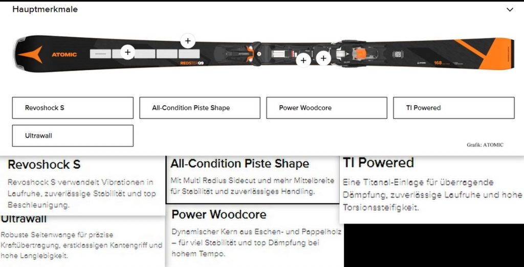 Breiter in der Mitte ist der ATOMIC REDSTER Q9.8, der auf 85 mm kommt; ansonsten ist der Aufbau und auch die Taillierung wie beim schlankeren Model Q9