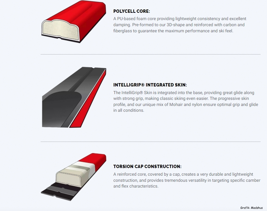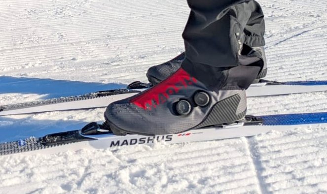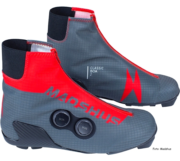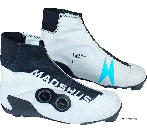 Wir haben den Ski mit den neuen Madshus Race Pro BOA® Classic Schuhen gelaufen; ein sehr leichter Schuh, der mit dem 2fachen Boa-Verschluss und seinem integrierten Power Chassis sehr gut am Fuß sitzt und eine außergewöhnliche Kraftübertragung und Skikontrolle ermöglicht.