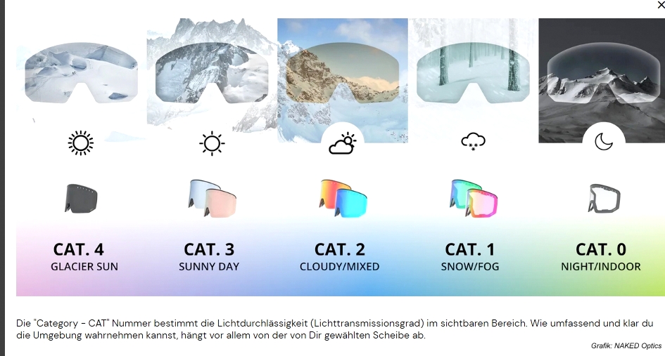 Die Wechselscheibe der Kategorie1/Stufe1 ist an Skitagen mit sog. flachem und diffusem Licht „angesagt“, die Kontraste und Strukturen der Schneeoberfläche werden erkennbar verstärkt. Auch wechselnde Licht- und Sichtverhältnisse – Bewölkung/Schneefall und Sonne, Licht und Schatten – sind mit dem Glas der Stufe 1 kein Problem, helles Licht ist nicht unangenehm, blendet nicht;. ich muss also nicht ständig die Scheibe wechseln.