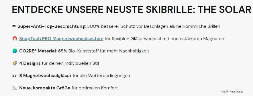 Wir sind überzeugt von der Skibrille THE SOLAR von NAKED Optics, der Tragekomfort, die sehr gute Passform und ihre hohe Funktionalität machen sie zu einer Top Skibrille für den ganzen Tag und das zu einem sehr angenehmen Preis.