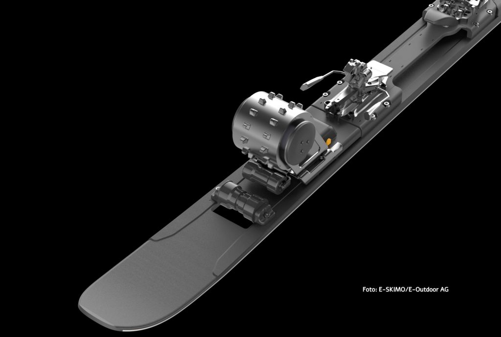 Das E-Skimo Skitourensystem überträgt das Prinzip des E-Bikes auf den Wintersport. Ein wartungsfreier 10-Nm-Nabenmotor ohne Getriebe, ein austauschbarer 246-Wh-Lithium-Akku und ein teilbarer Antriebsstrang im Schneemobil-Stil bilden das Herzstück des innovativen Systems. Der Nabenmotor zieht das Steigfell unter dem Ski durch und unterstützt so die Vorwärtsbewegung, für die Abfahrt wird das Antriebssystem + Fell demontiert.