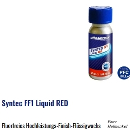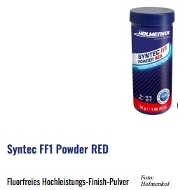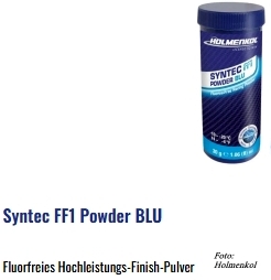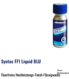Diese Racing Finish Wachse sind die aktuellen „highend“ Produkte von Holmenkol; einfache/schnelle Anwendung vor dem Wettkampf, max. Gleitvermögen. Diese natürlich auch fluorfreien Wettkampfwachse bietet Holmenkol als Pulver – HOLMENKOL Syntec FF1 Powder – Wachs und auch in flüssiger Form – HOLMENKOL Syntec FF1 Liquid – an.