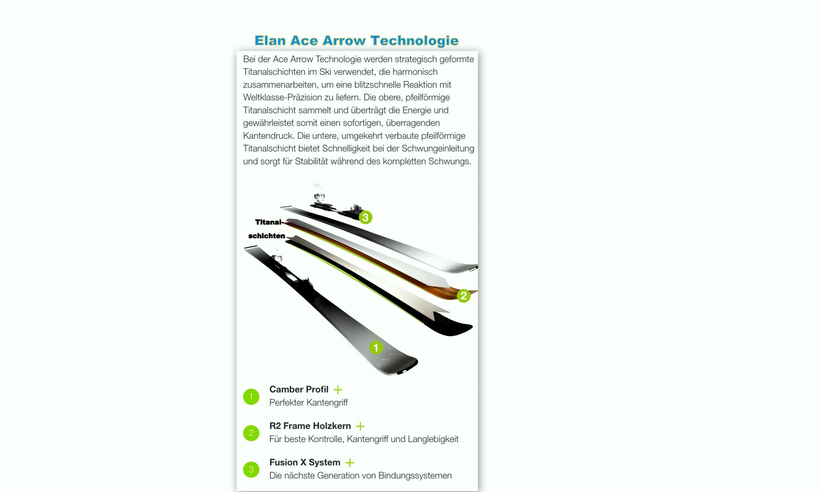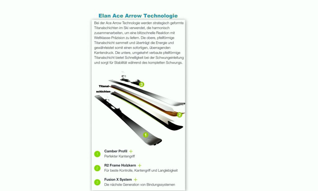 Die „1. Garde“ der neuen Ace Familie ist konsequent mit zwei Titanaleinlagen ausgestattet. „Dabei ist die obere Lage pfeilförmig, damit die gesamte Energie direkt auf die Kanten und das Camberprofil übertragen wird. Die untere Titanalschicht ist hingegen als umgekehrter Pfeil geformt, wodurch eine schnellstmögliche Kurveneinfahrt und maximale Stabilität am Ende des Turns garantiert sind.“
