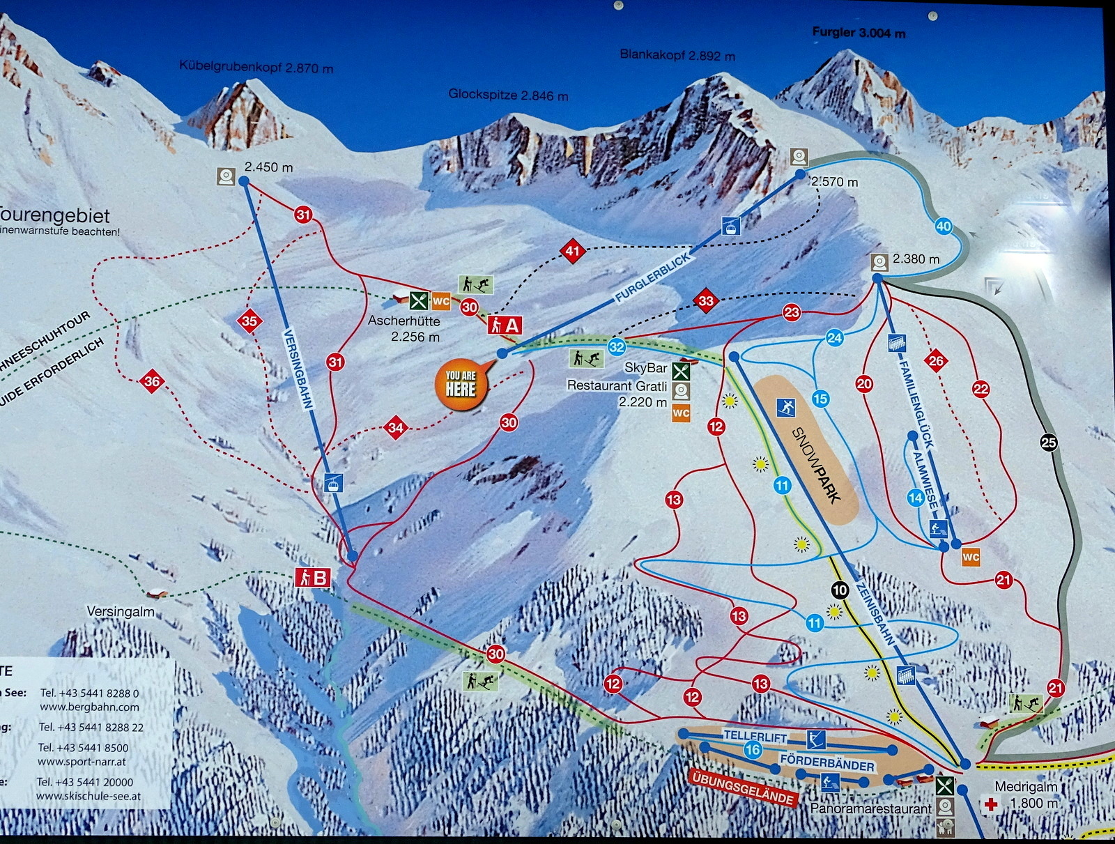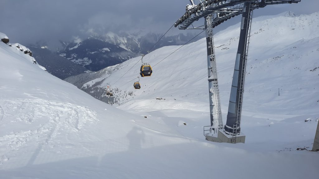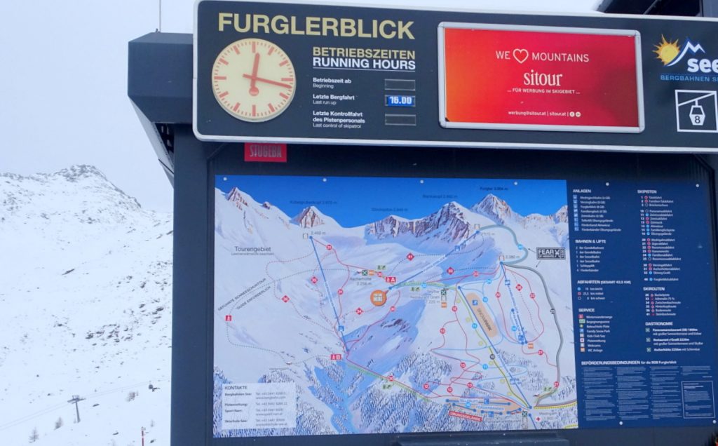 Die blaue Piste 32 / Skiweg Gratli zur Furglerblick Bahn, mit der Bahn hoch auf 2570 m Höhe (höchster Punkt des Skigebiets, dann die blaue Abfahrt 40 / Furglerblick und 24 / Familienabfahrt zurück zur Bergstation Zeinis oder weiter über die blauen Abfahrten 15 / Familienglück und 11 / Zeiniswald runter bis zur Bergstation der Medrigjochbahn – immerhin fast 800 Höhenmeter blaue Abfahrt ohne irgendeine Problemstelle; ein großes Lob an die Pistenbauer in See!