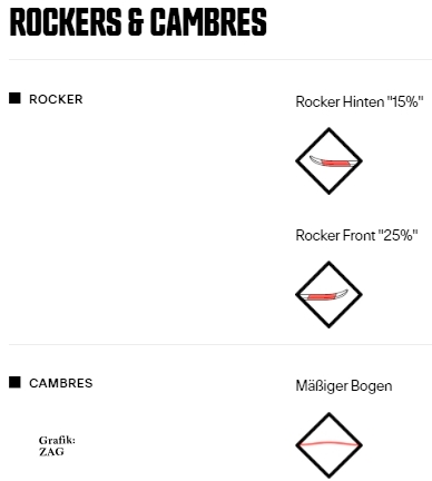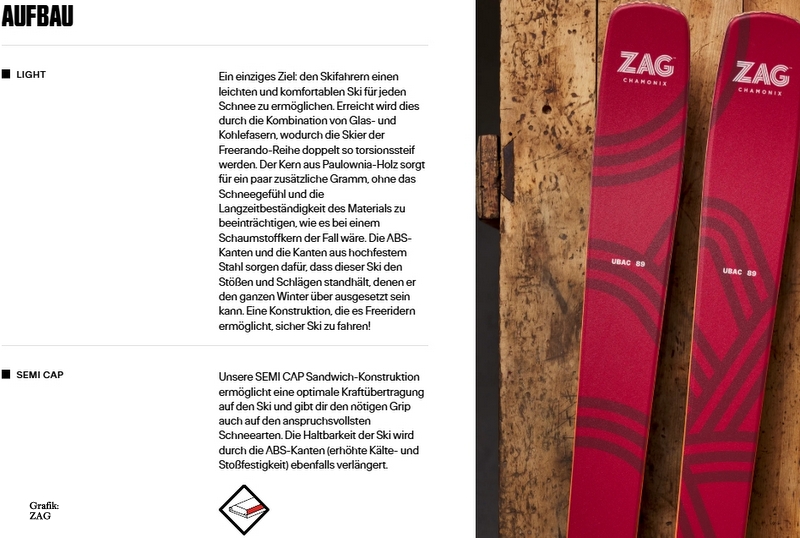 Der ZAG-Ski ist eher traditionell aufgebaut: Paulownia Holzkern,Carbon-/Kevlarfasern, Phenol-Seitenwangen. Dazu ein deutlicher Tip- und ein gemäßigter Tailrocker. Ähnlich wie DPS arbeitet ZAG auch daran, Carbon-/Kevlarfasern durch Flachsfasern zu ersetzen. Man spürt einen guten Auftrieb im Tiefschnee, aber gleichzeitig einen guten Grip auf hartem Untergrund.