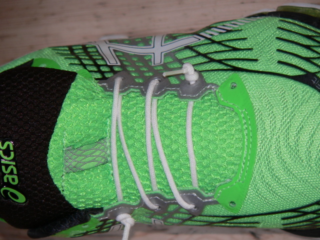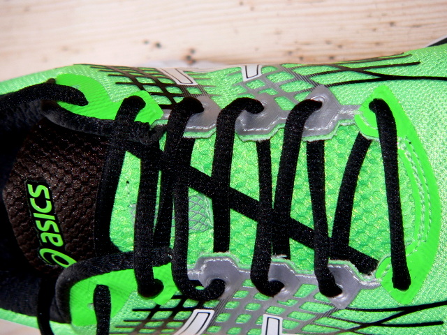 Der erste Eindruck- nachdem man sich an die Farbe grün gewöhnt hat (er wird zur Beruhigung aber von asics in 4 Farbvariationen – Grundtöne grün, schwarz, blau oder weiß – angeboten) : Der Schuh ist sehr leicht (Gr.42,5 – 295 Gramm!), bei stabilem Fersensitz unglaublich bequem. Das im medialen Mittelfußbereich platzierte sehr atmungsaktive und elastische Mesh-Material reicht bis in die Schnürleiste, sorgt für festen Sitz im Mittelfußbereich und erlaubt eine individuelle Anpassung an den Fuß, denn die Ösen für die Schnürsenkel sind einzeln positioniert. Darüber hinaus lässt sich natürlich durch eine variable Schnürtechnik der Schuh problemlos auf die individuelle Fußform oder die jeweilige Befindlichkeit einstellen. Variable Schnürtechnik: Schlaufen-Technik (Komfortabel für den Spann) : Mach eine Schlaufe. Dadurch erhälst du einen bequemen und festen Halt am Fuß. Dein Fuß rutscht nicht im Schuh, egal auf welchem Gelände du bist. Diagonale Technik ( Befreie deine