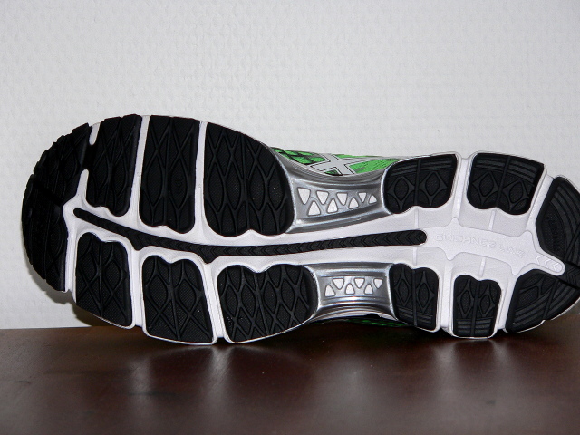 Der Schuh ist so leicht geworden, weil man Nähte eingespart hat, das nahtlose Obermaterial bietet fast „sockenähnliche“ Passform. Außerdem bringt das flache Mittelsohlenniveau mit einer Sprengung von nur 10mm ( beim Damenmodell ist die Sprengung 3mm höher ) auch weniger Gewicht und erlaubt ein direkteres Gefühl für den Boden. Außen angebrachte Verstärkungen sind verantwortlich für den sehr guten Fersenhalt. Die GEL-Dämpfungselemente im Vor- und Rückfußbereich sorgen für eine effektive Reduktion der Aufprall-, Scher- und Abdruckkräfte. Dazu kommt eine COMFORDRY-Einlegesohle ( ORTOLITE ist hochreaktiv ) mit hoher ückstellenergie, die für eine optimale und komfortable Fußbettung sorgt. Auffällig ist eine S-förmige Einkerbung, die sich über die gesamte Sohle zieht. Diese Flexkerbe (Guidance Line) soll den Fuß während des Bodenkontaktes stabilisieren, ein natürliches Abrollverhalten erleichtern. Bei Herren- und Damenschuhen ist der Verlauf dieser Flexkerbe unterschiedlich. Für die Außensohle wird eine neuartige Gummimischung an den „kritischen“ Bereichen eingesetzt, um mehr „Grip“ aber auch eine längere Haltbarkeit zu erreichen.