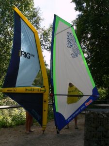 Das iRIG besteht aus EINEM aufblasbaren „Körper“ – Mast und Segel sind EINE Fläche, der „Gabelbaum“ hat sich zu jew. 2 Haltegriffen auf jeder Seite entwickelt und die „Startschot“ besteht nur noch aus zwei Griffschlaufen an der Vorderseite.