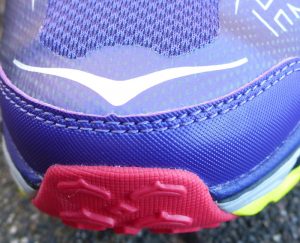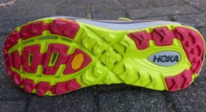 Hoka–Schuhe fallen immer wieder auf den ersten Blick durch ihre XL – Sohle auf, so auch der Trailschuh Mafate Speed 2. Aber bei Hoka ist Sohle nicht gleich Sohle; hier ist es eine doppelschichtige CMEVA- mit RMAT-Zwischensohle und einer Vibram Megagrip-Außensohle mit Flexkerben. Die Sohle ist als sog. Rocker-Sohle vorn leicht aufgebogen – Hoka: Early-Meta-Rocker-Sohlenaufbau – und hat eine Sprengung von 4 mm; dadurch unterstütz sie die Abrollbewegung des Fuße spürbar. Die Sohle hat – wie alle Hoka-Schuhe – eine beeindruckend gute Dämpfung, sinkt aber beim Fersenaufsatz nicht weich ein – ein guter Kompromiss zwischen bequemer Dämpfung und Stabilität. Der Griff der stolligen Vibram-Sohle ist auf jedem Untergrund gut, diese Griffigkeit wird noch durch die breite Sohlenform unter Ferse und Ballen unterstützt, die dem Fuß auch seitlich sehr guten Halt gibt.